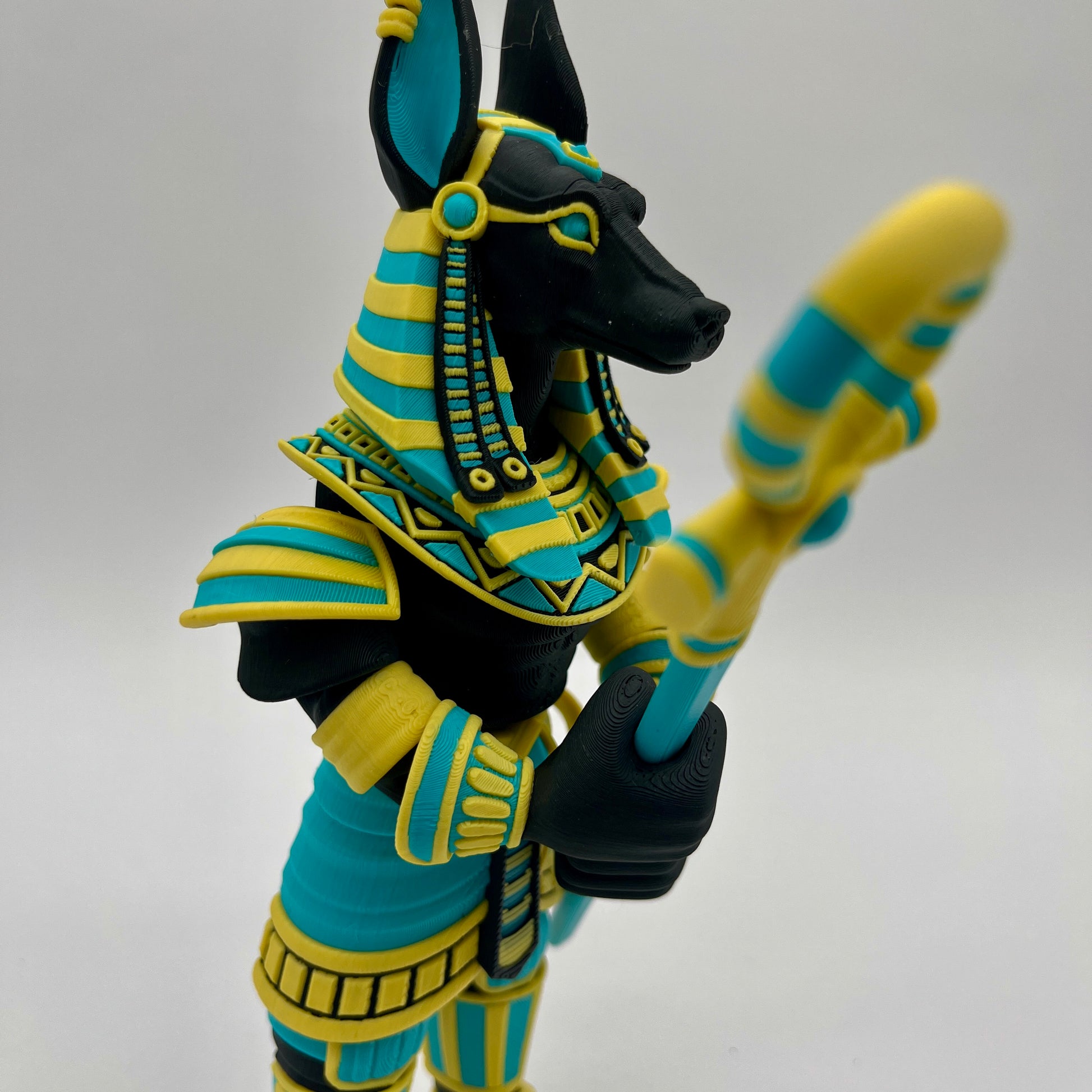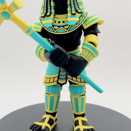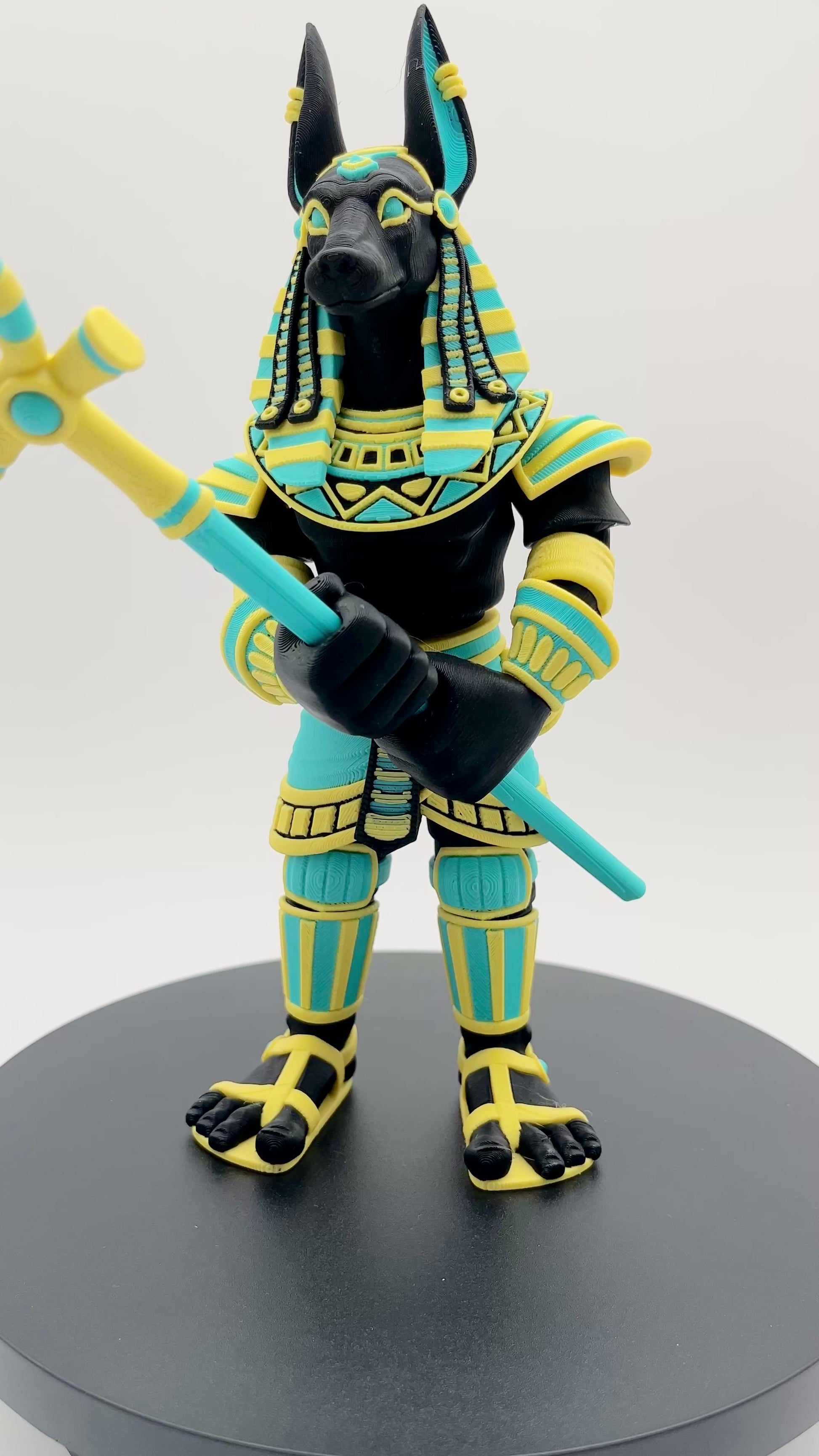 Commanding and regal, Anubis stands in jet-black armor trimmed with sun-yellow and Nile-teal accents. The guardian grips a ceremonial staff and includes a matching sword so you can switch between priestly and battle-ready display. Sculpted panel lines, beaded collar details, and sandal armor give it a museum-style look that pops on shelves, desks, and themed displays. Printed by 3BC Creations for crisp detail and a smooth finish. 3D printed with PLA. Decorative collectible—not a toy.