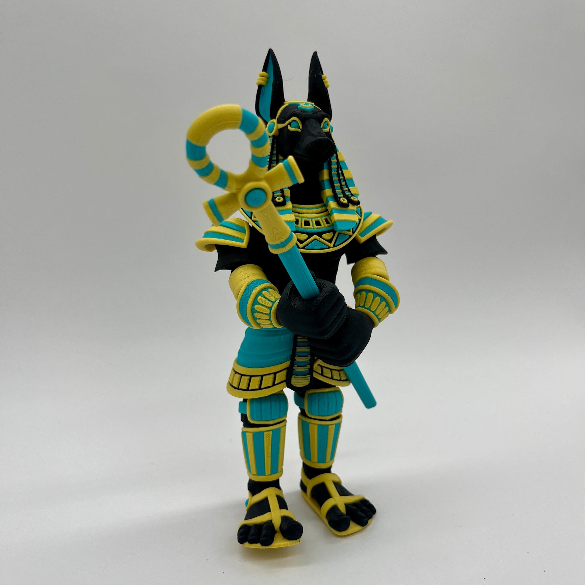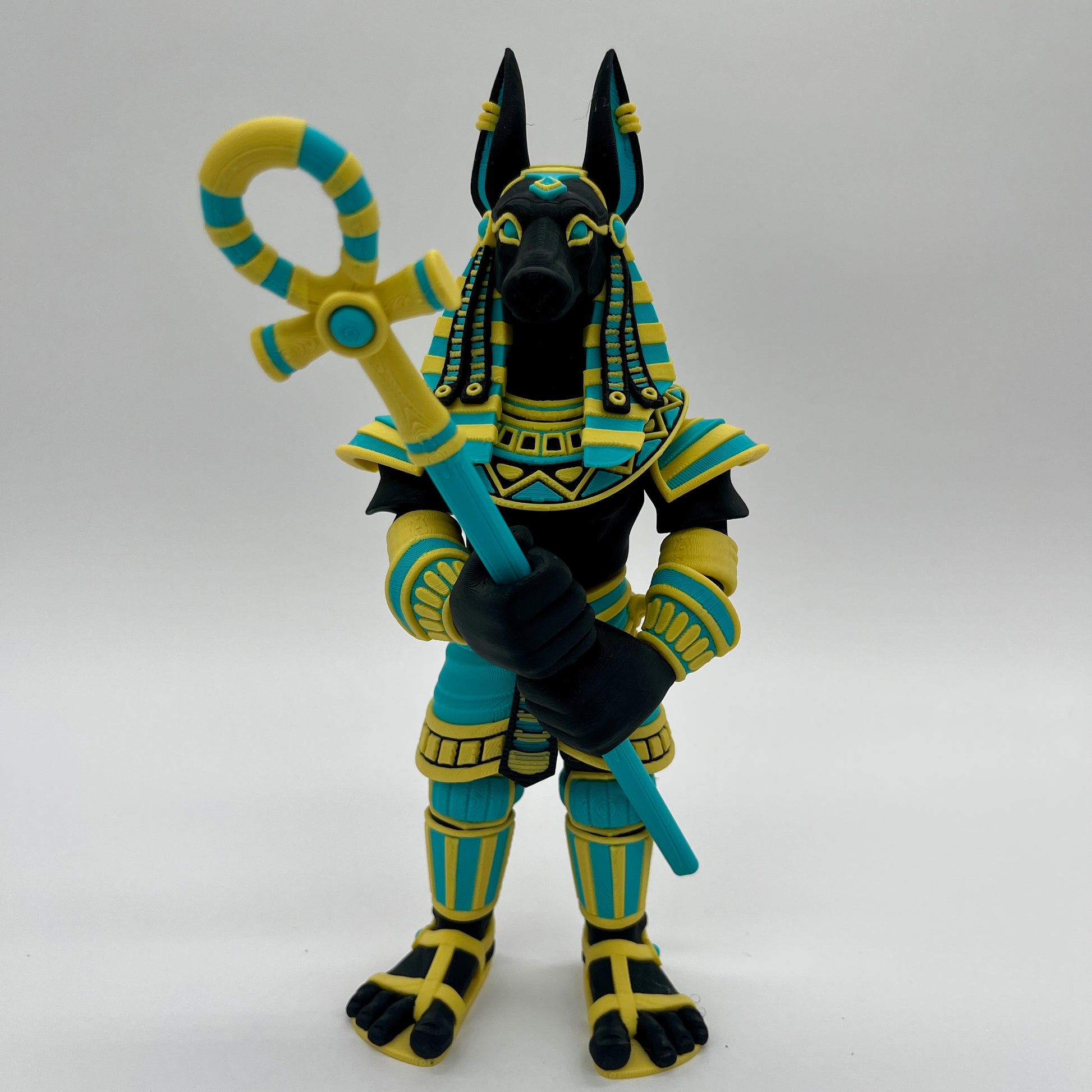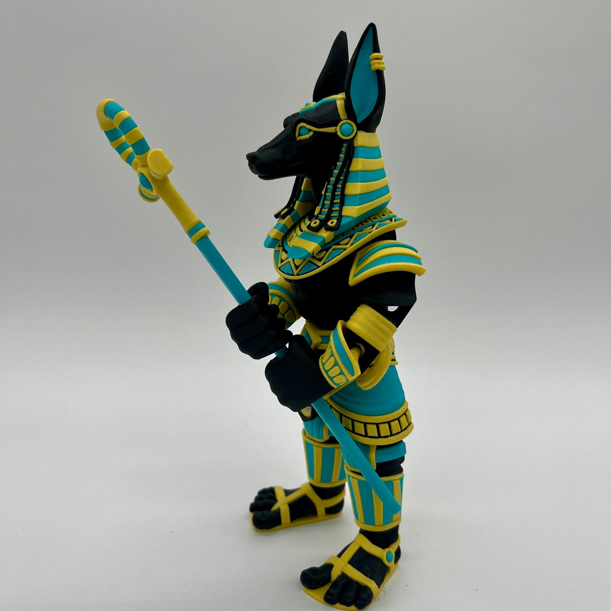 Commanding and regal, Anubis stands in jet-black armor trimmed with sun-yellow and Nile-teal accents. The guardian grips a ceremonial staff and includes a matching sword so you can switch between priestly and battle-ready display. Sculpted panel lines, beaded collar details, and sandal armor give it a museum-style look that pops on shelves, desks, and themed displays. Printed by 3BC Creations for crisp detail and a smooth finish. 3D printed with PLA. Decorative collectible—not a toy.
