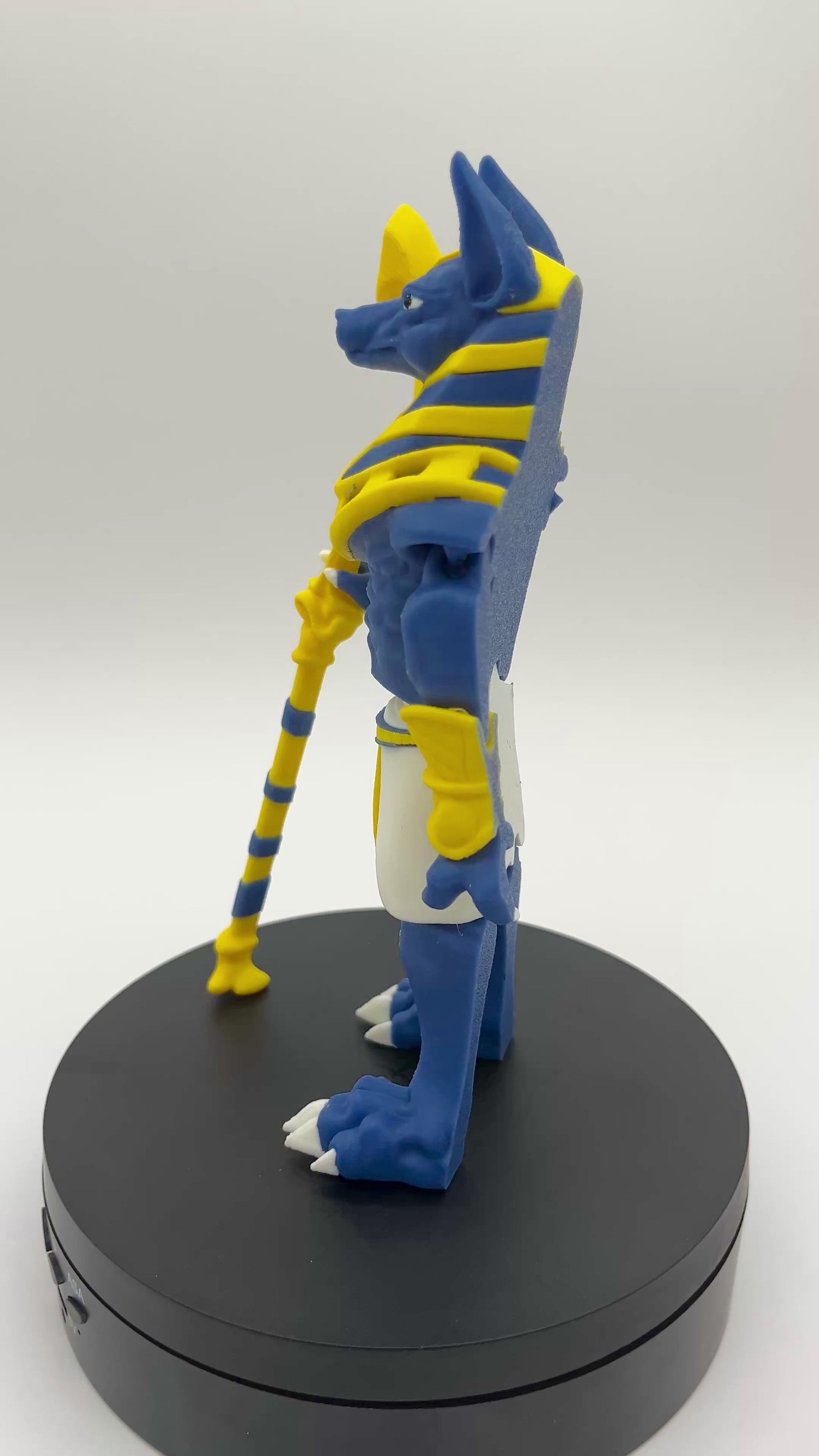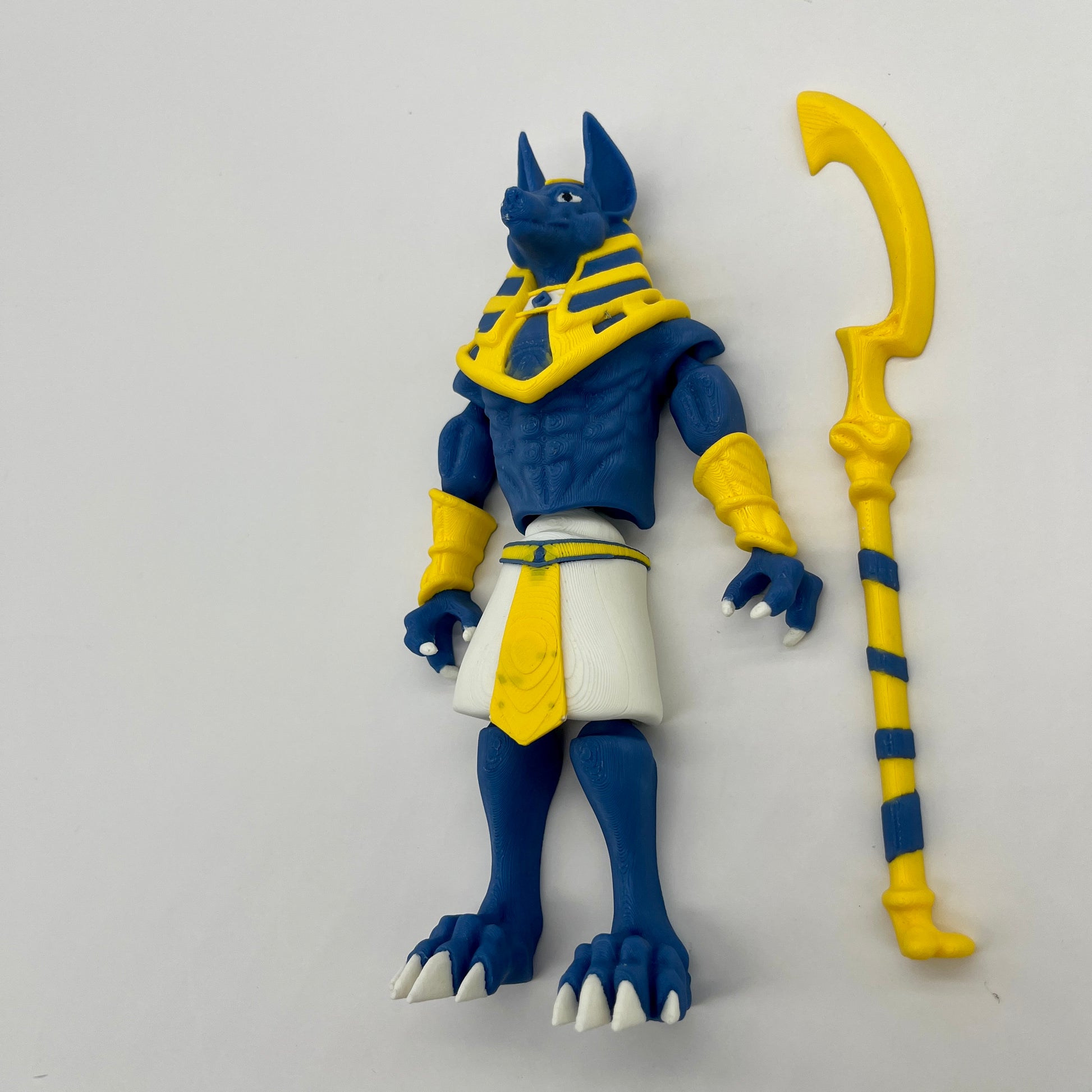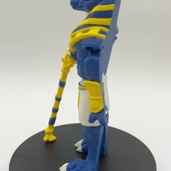 Standing tall and unblinking, Anubis keeps watch for lost souls. Cloaked in royal blue and Yellow with a crescent staff in hand, this guardian brings ancient desert energy to shelves, desks, and altar spaces. Each piece is 3D printed with PLA and finished by hand for crisp details and a clean display look.