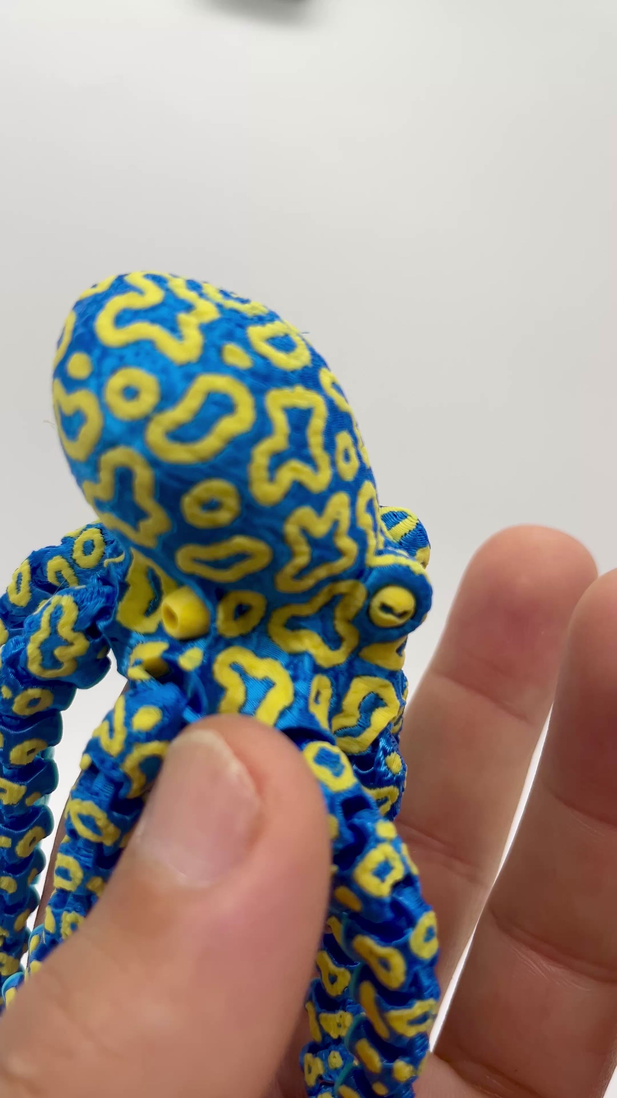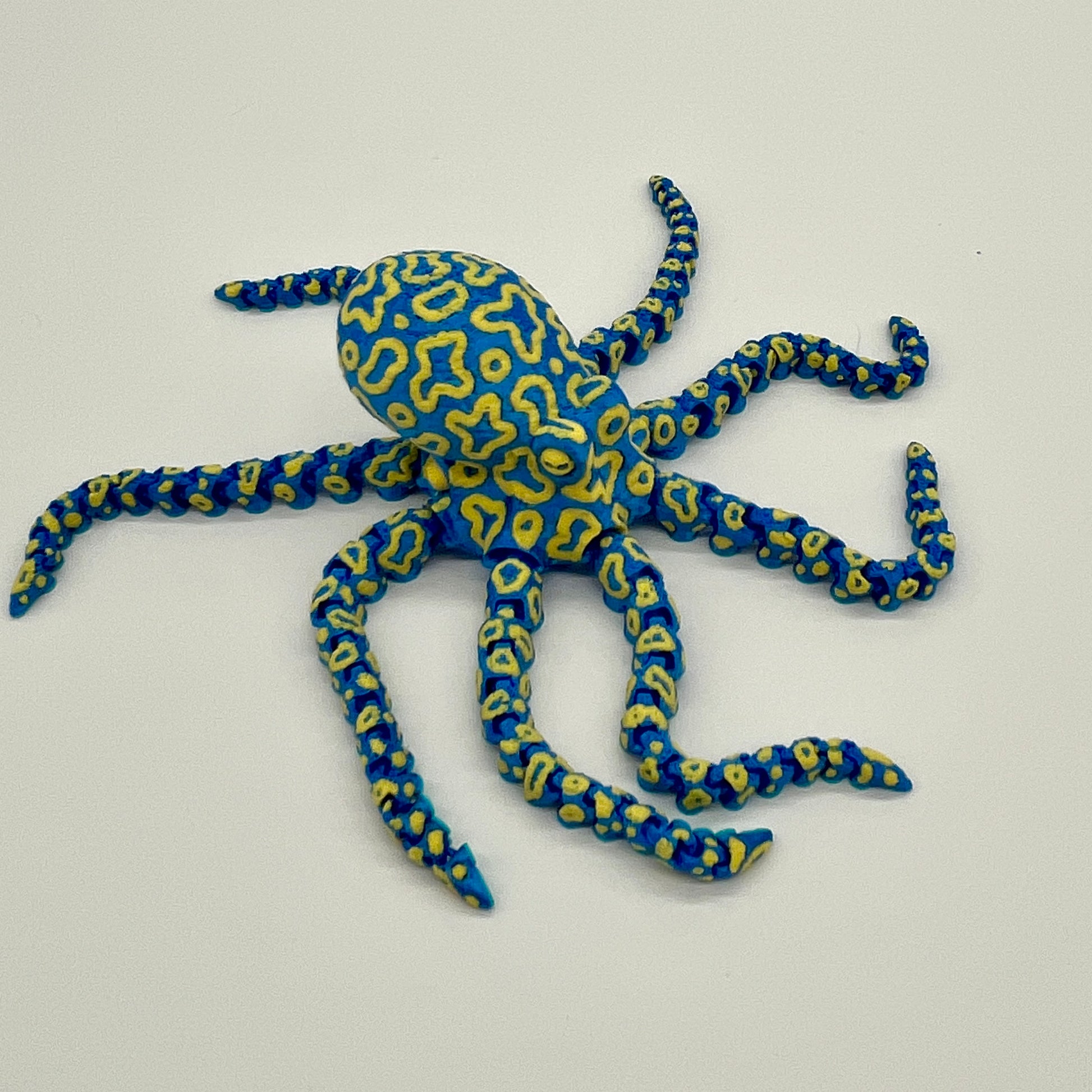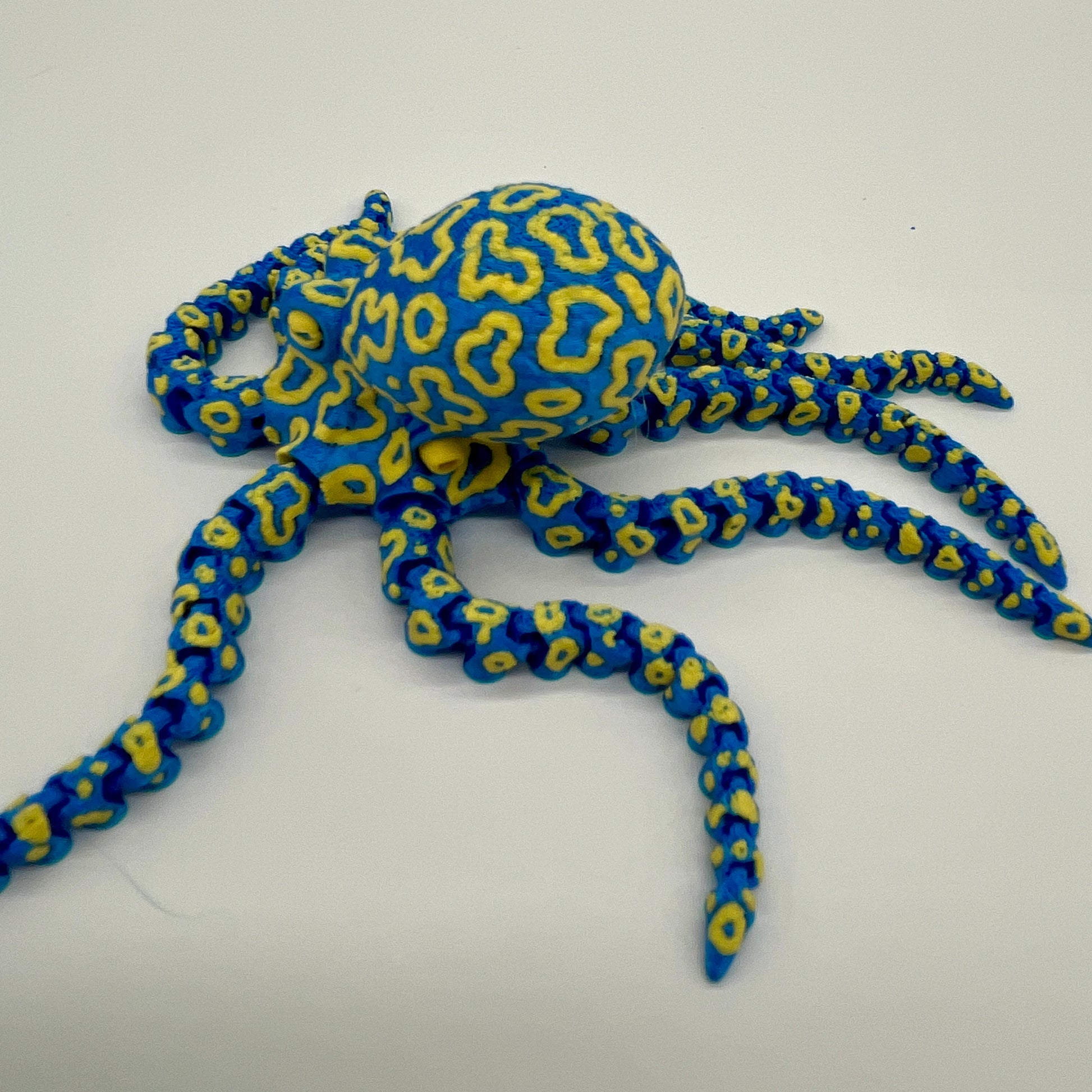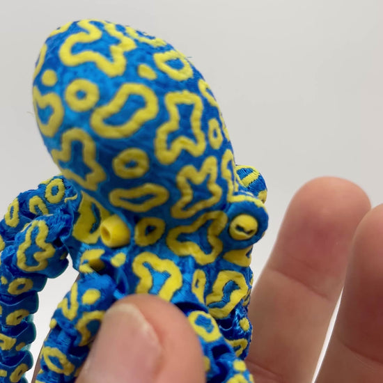 Make a splash on any shelf or desk with this vibrant Mini blue & yellow ringed octopus. Sculpted texture and bold ring pattern give it a lively reef look, while the segmented arms are poseable so you can fan them out or curl them for different displays. 3D printed with PLA for crisp detail and durability.