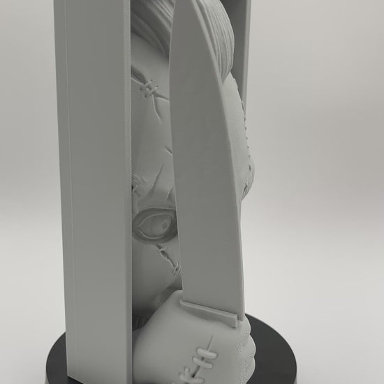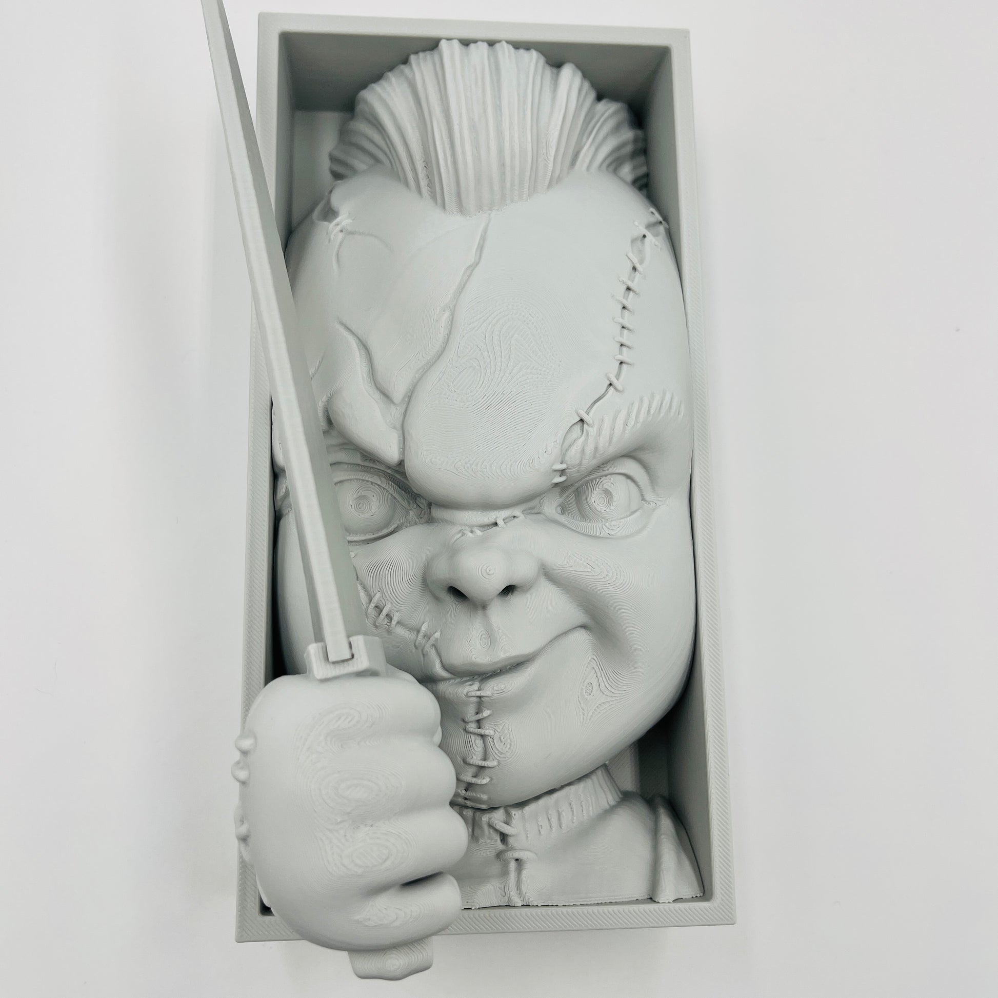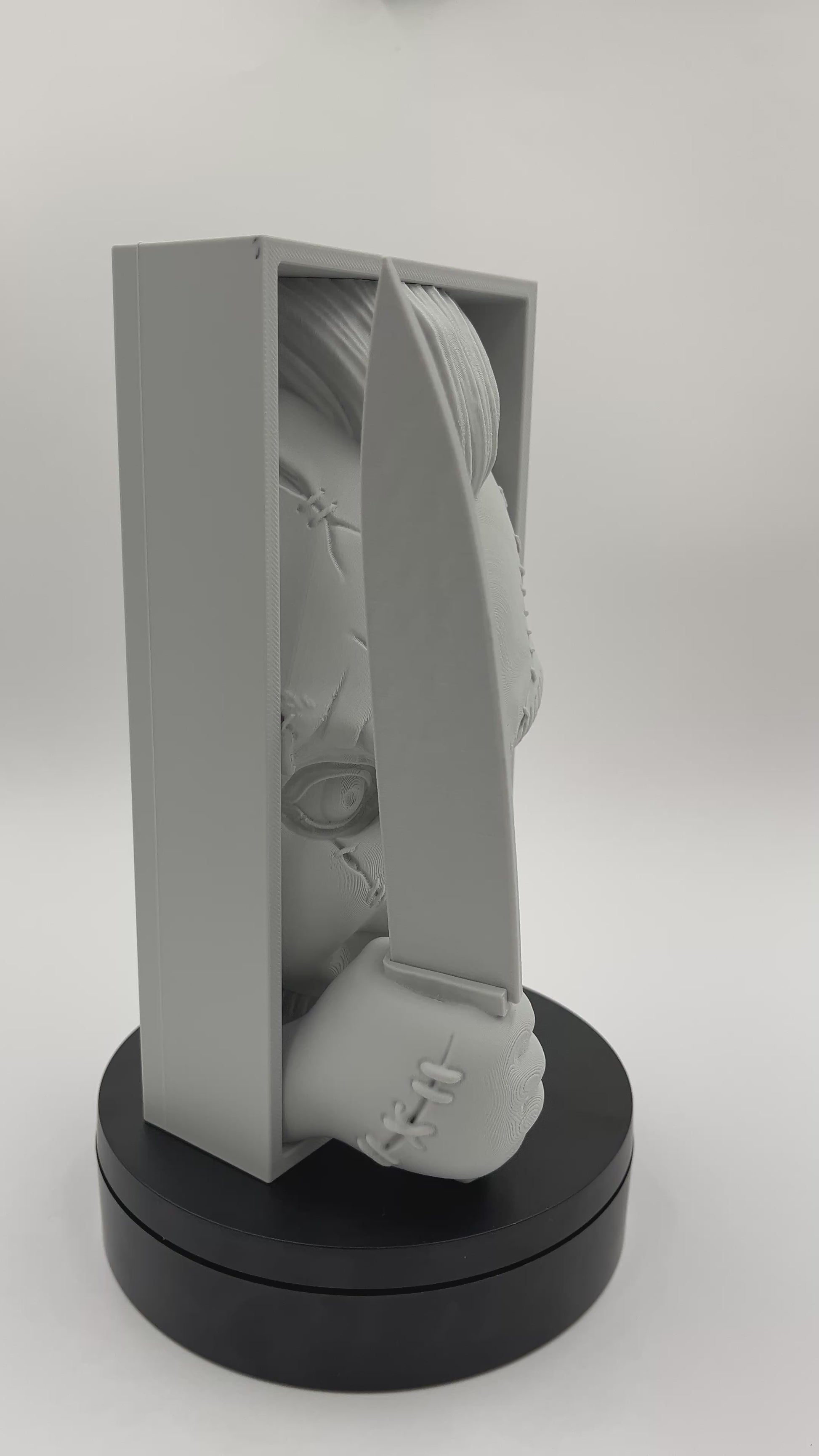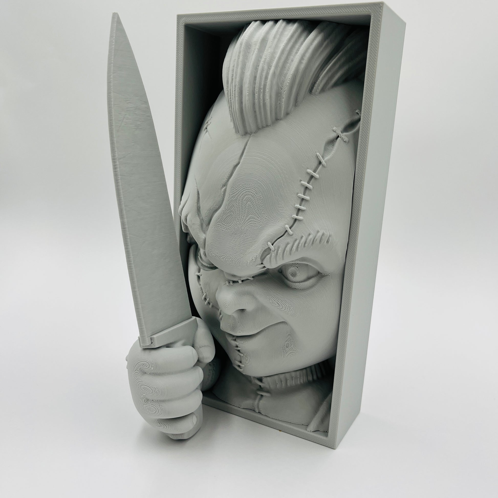 Give your bookshelf a wicked wink with this Chucky-in-the-box book nook. The sculpted face, stitched details, and raised knife burst from a recessed frame, creating a dramatic, horror-themed accent that suits shelves, media rooms, and Halloween displays year-round. This collectible is fan art and is not affiliated with or endorsed by the rights holder. Designed by Treedigineer and printed by 3BC Creations for crisp detail in a clean matte finish, it’s 3D printed with PLA and arrives display-ready.