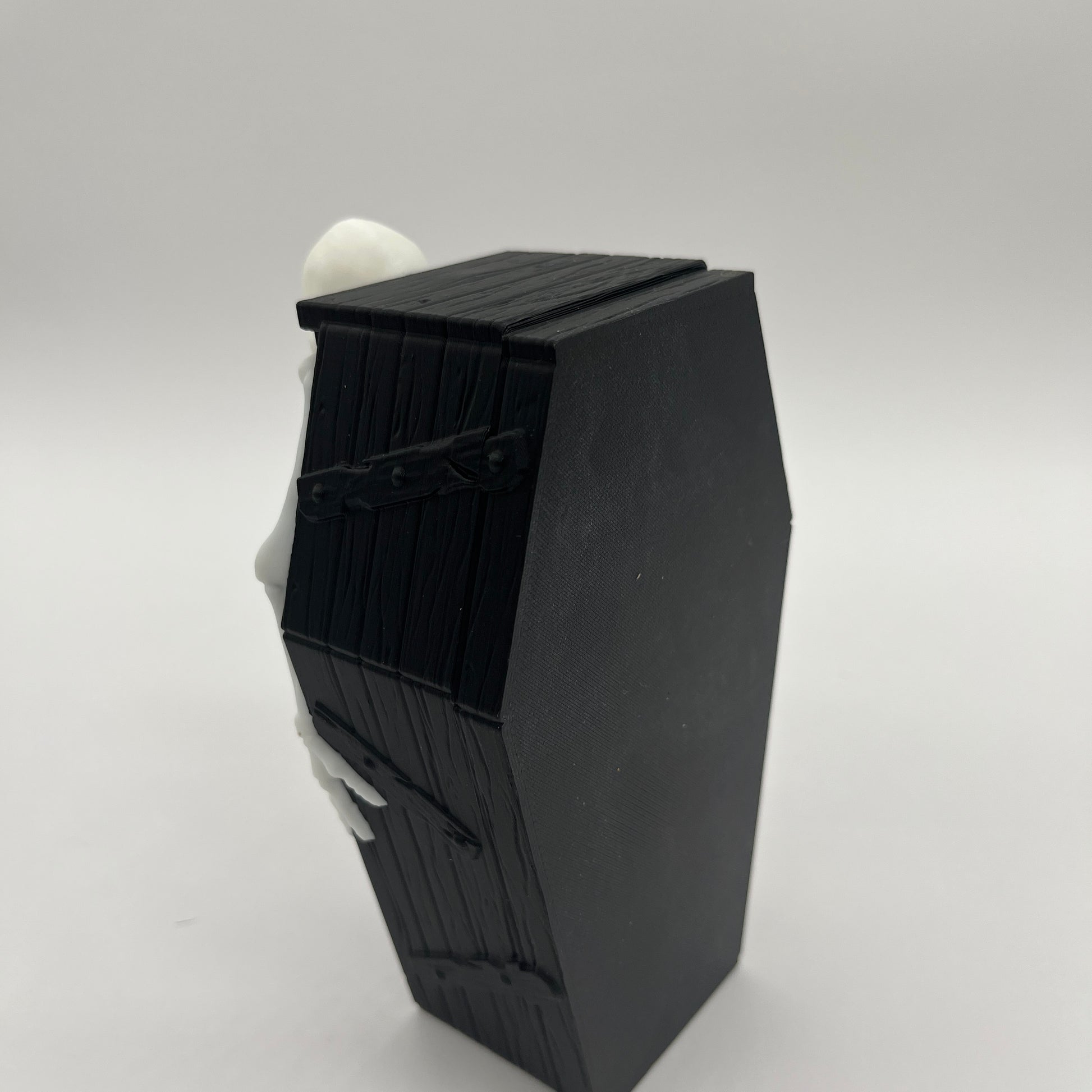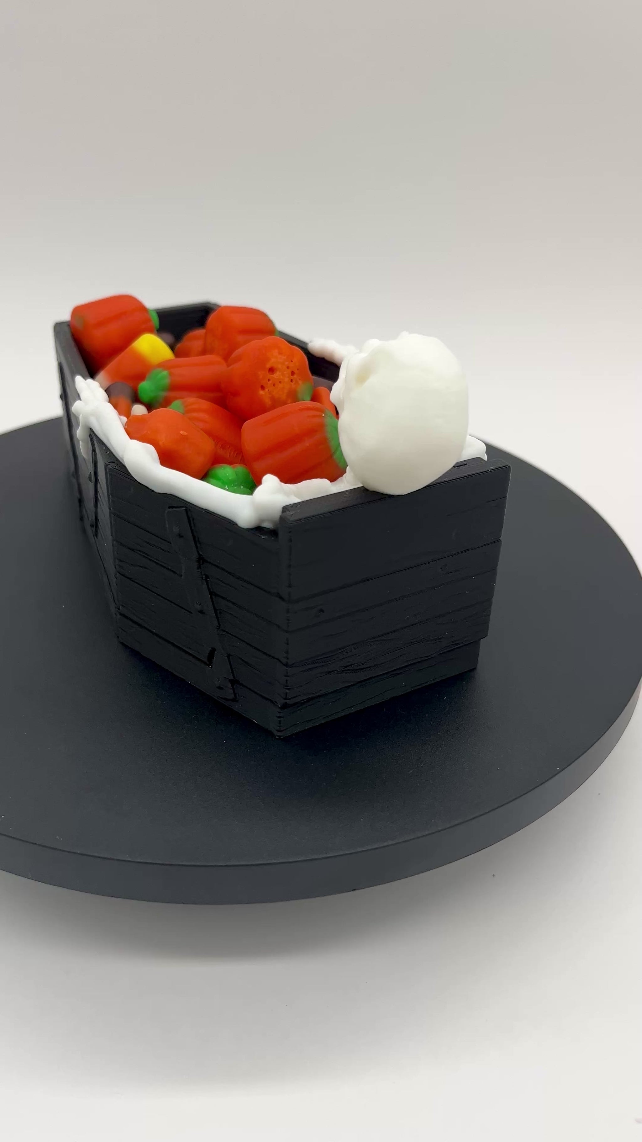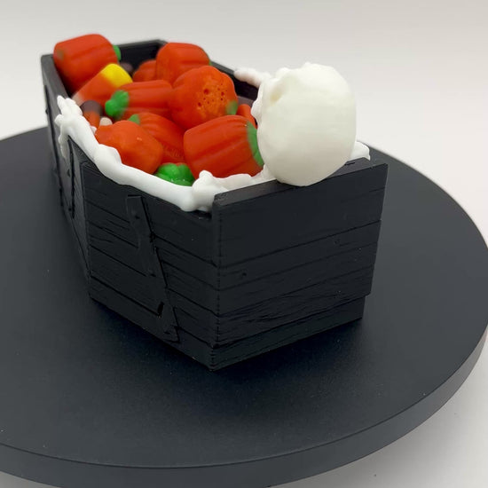 This DeathTub candy holder adds a playful touch of creep to your counter, desk, or party table. A grinning skeleton lounges over a wood-grain coffin tray—perfect for displaying wrapped treats all season. 3D printed with PLA. Decorative item—not a toy. Treats not included.
