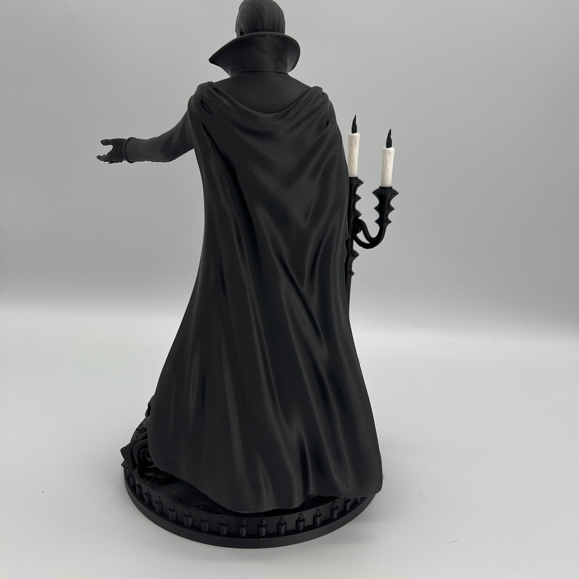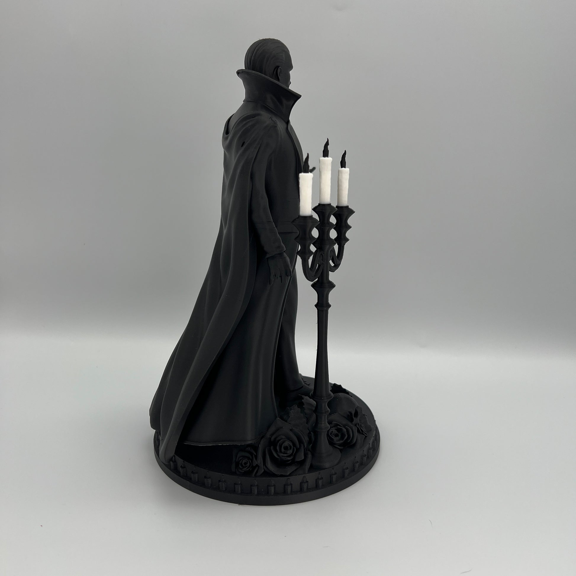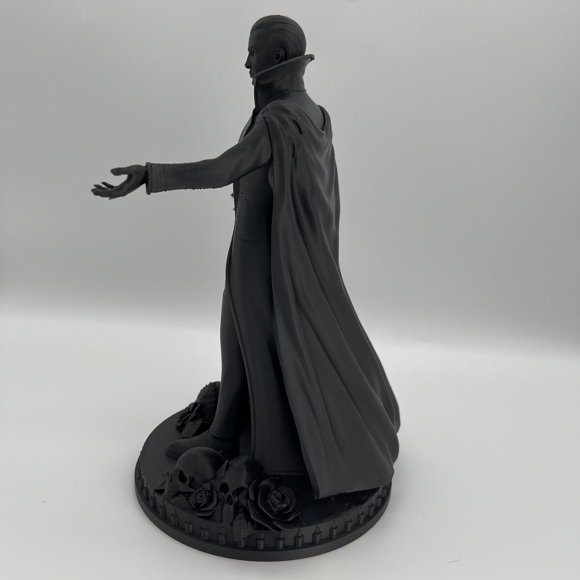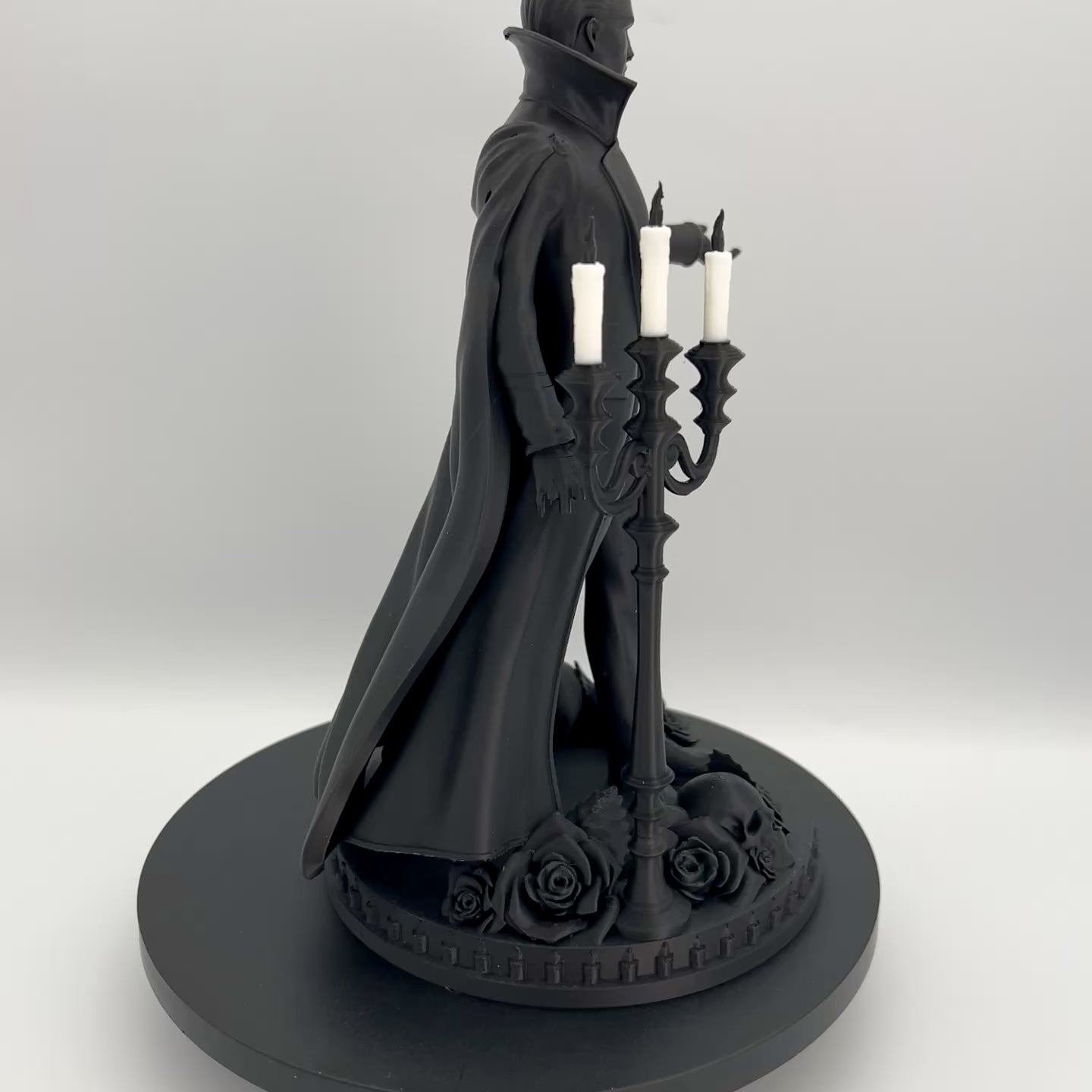 Commanding and elegant, this Dracula statue brings classic gothic drama to your shelf or mantel. Cloaked in a sweeping cape and posed on a skull-and-rose base, the matte charcoal finish gives it a stone-like presence that fits modern or vintage interiors alike. Produced by 3BC Creations LLC and finished for crisp detail and clean edges.