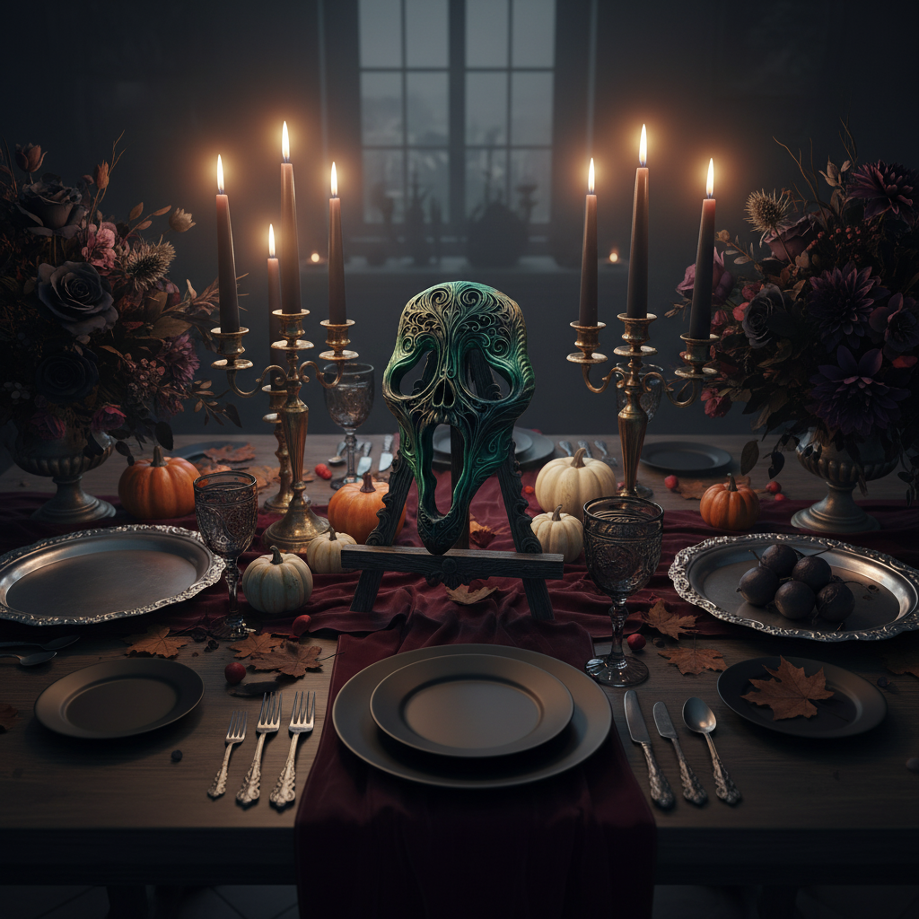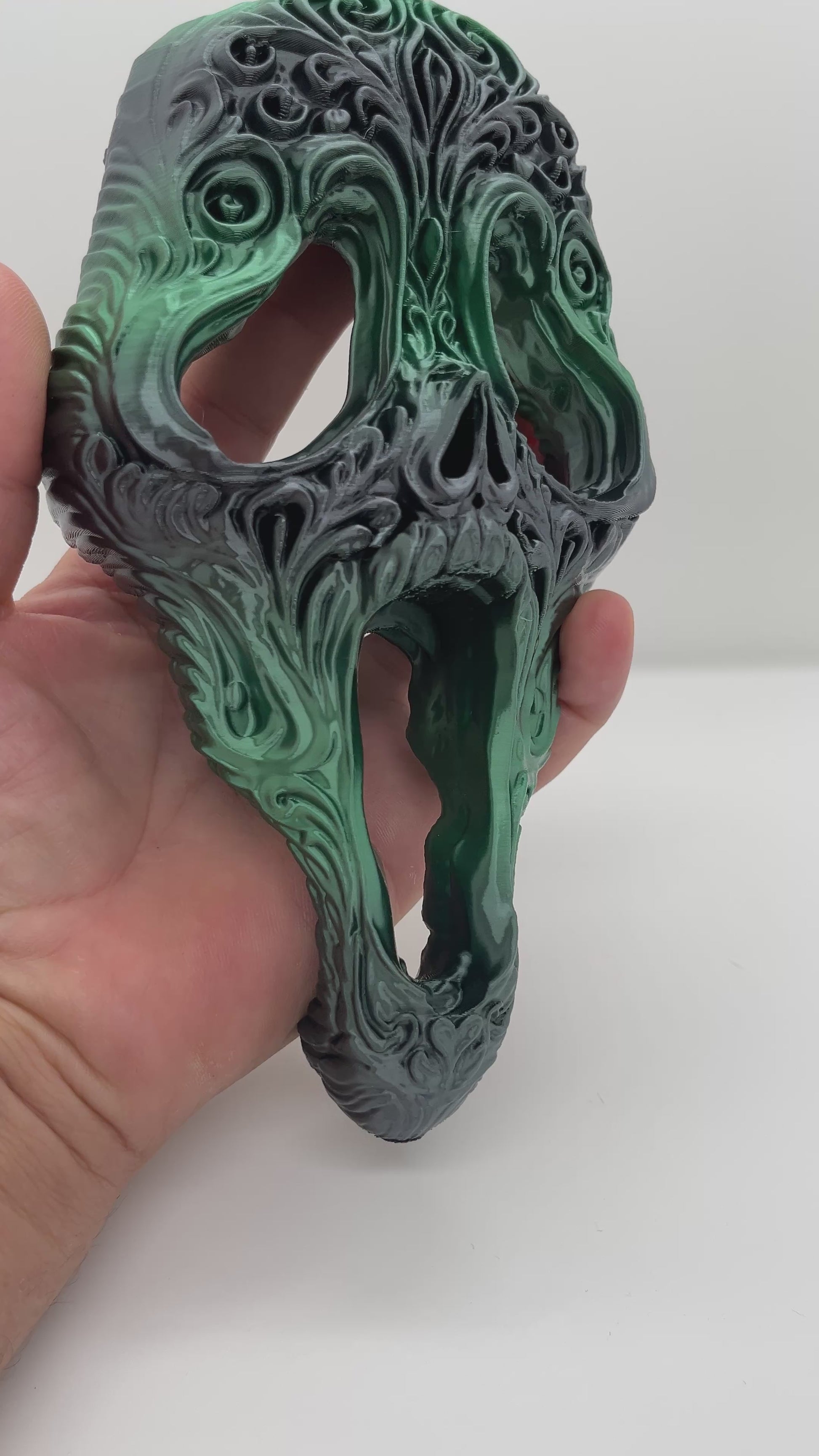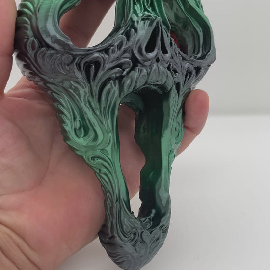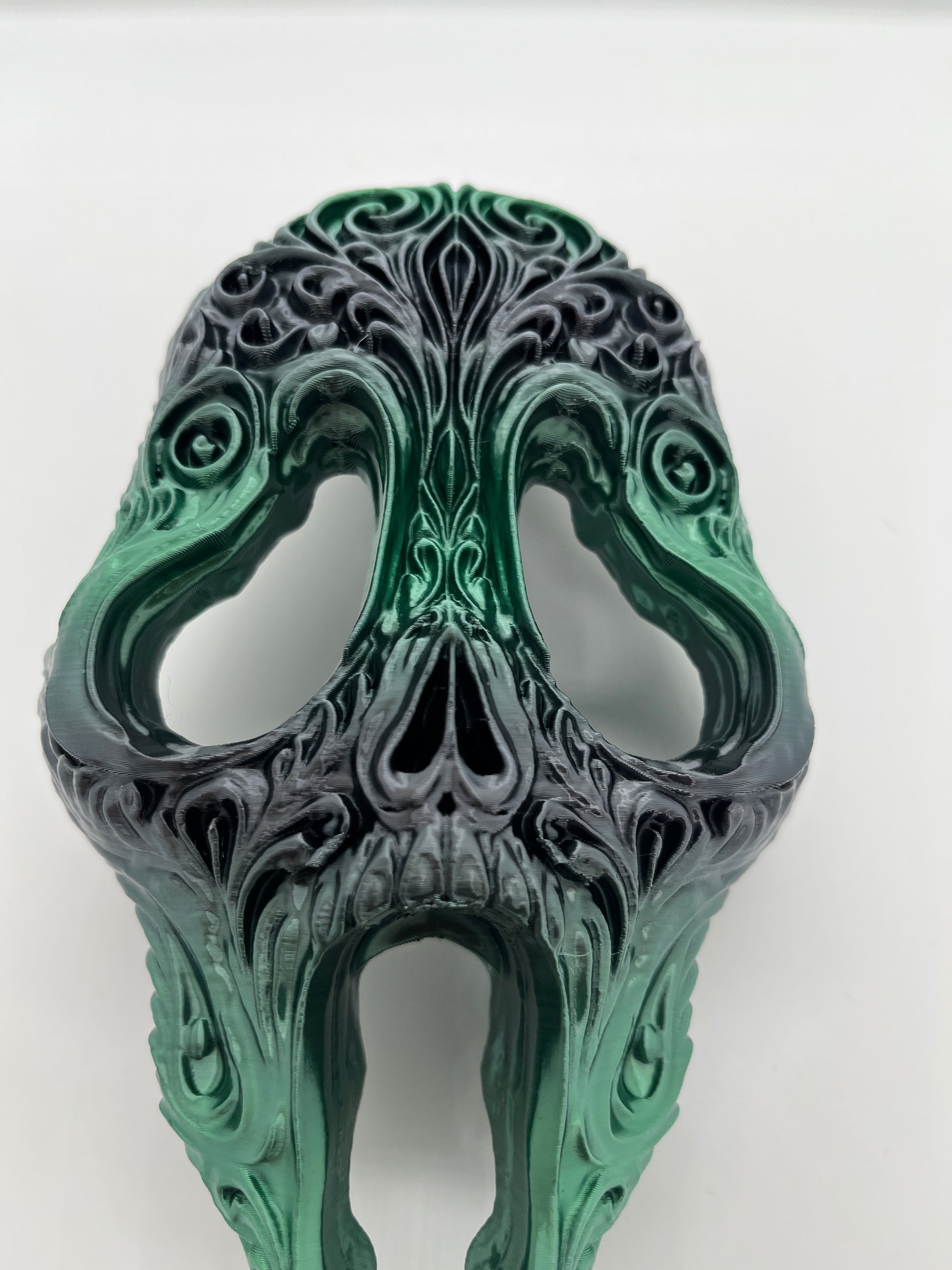 A high-detail decorative sculpture blending gothic filigree with sugar-skull style. Finished in a silky black→green gradient that catches light and shows off the carved linework. Display on a shelf, in a shadow box, or mount to a wall for bold Halloween or year-round dark-art vibes.