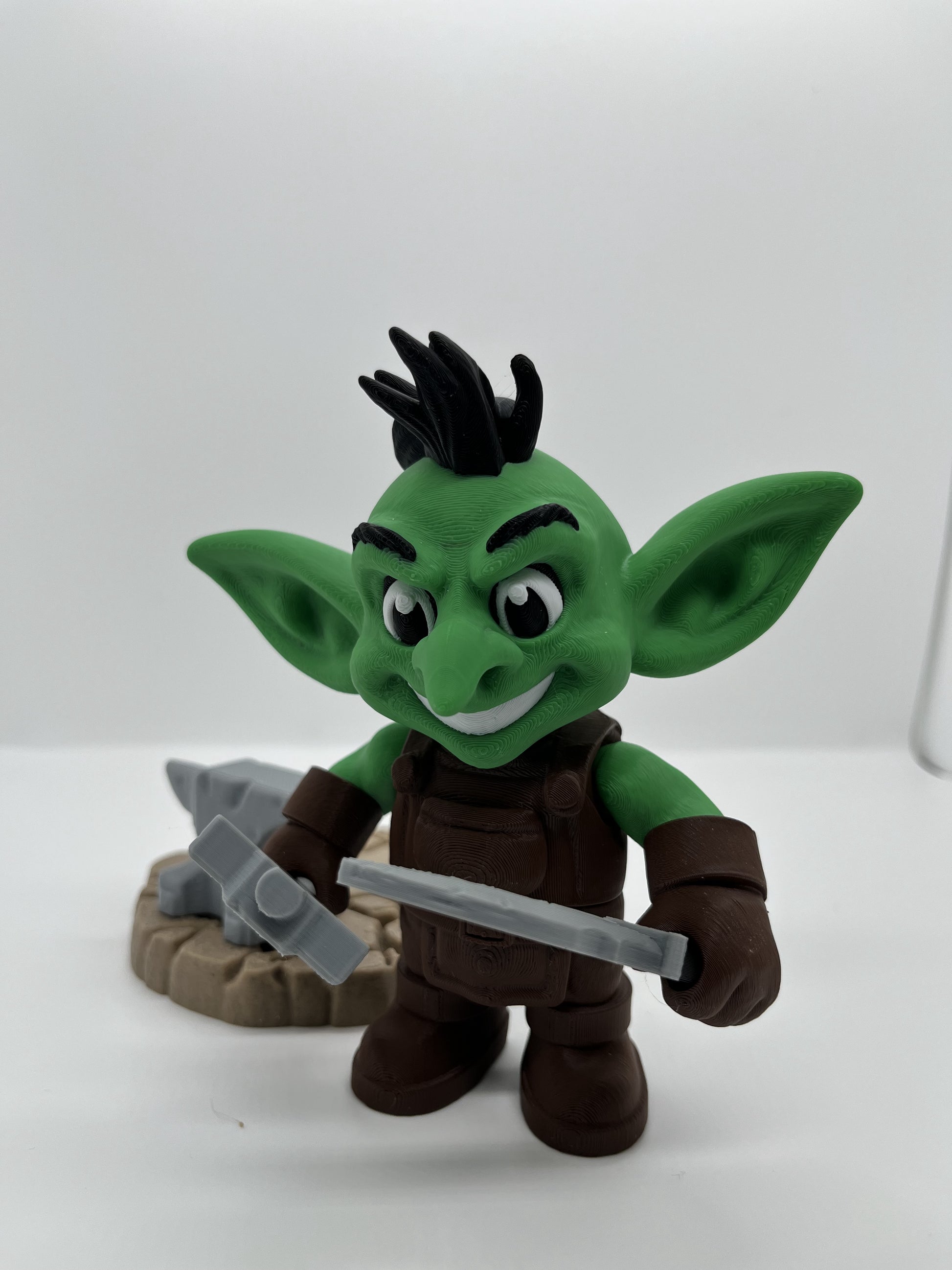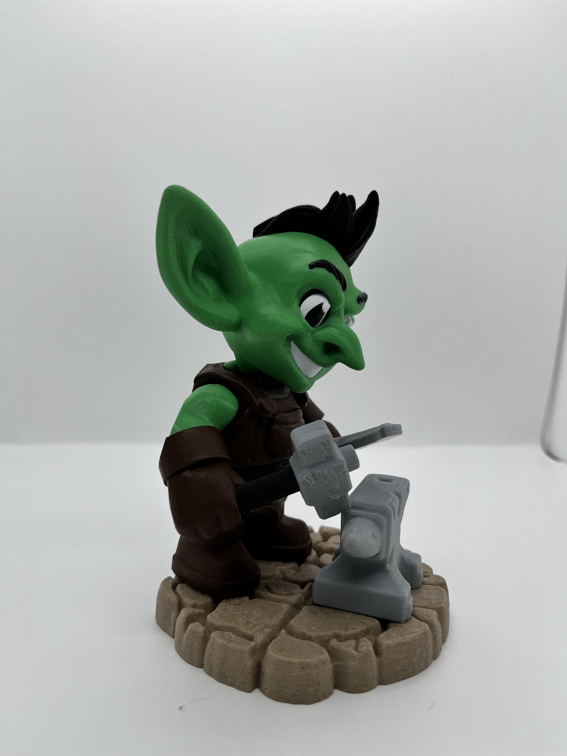 Charming workshop scene with green goblin smith on stone base