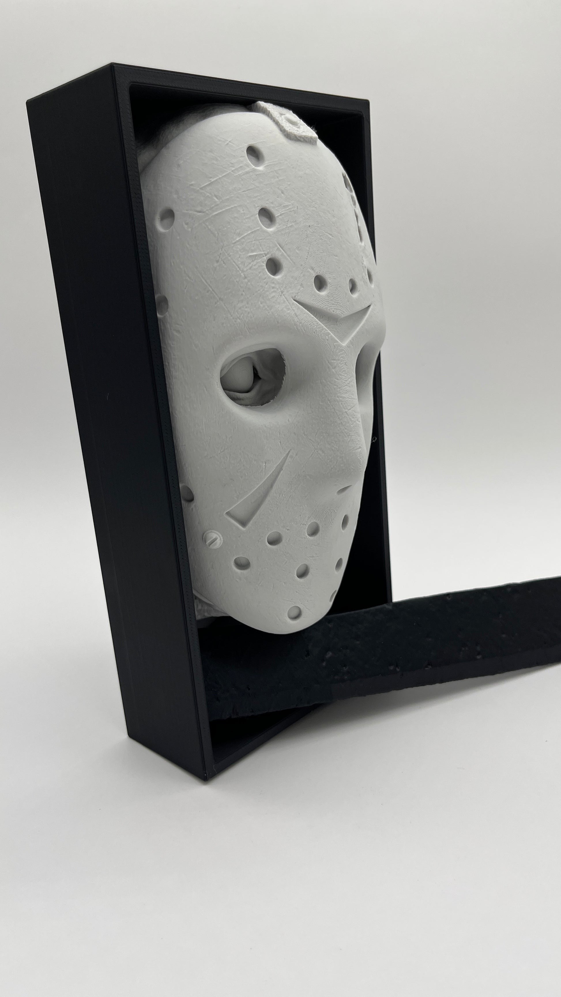 Level up your shelf with this bold Jason Wall Face Decor —a hyper-detailed art decor pushing through a frame with a playfully menacing tongue. The deep, sculpted texture grabs light and shadow, keeping books upright while doubling as a statement piece of art. Professionally 3D printed by 3BC Creations for crisp features and a clean, modern stone look.
