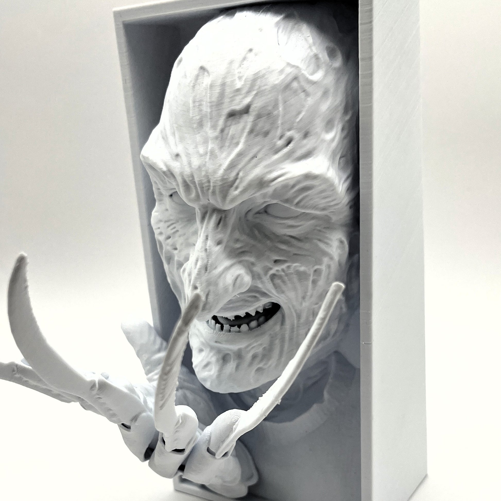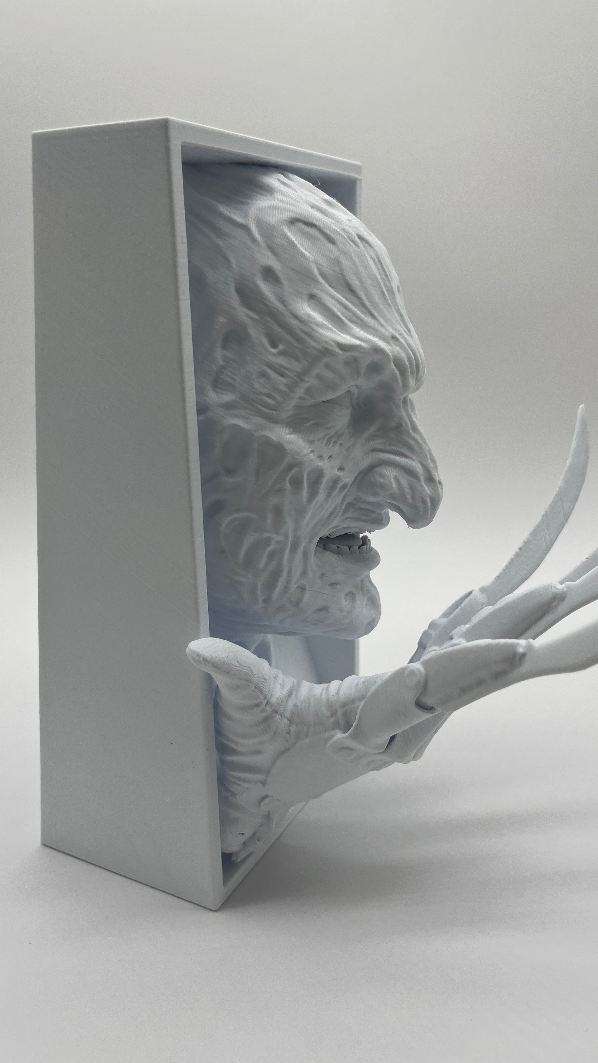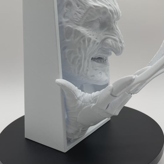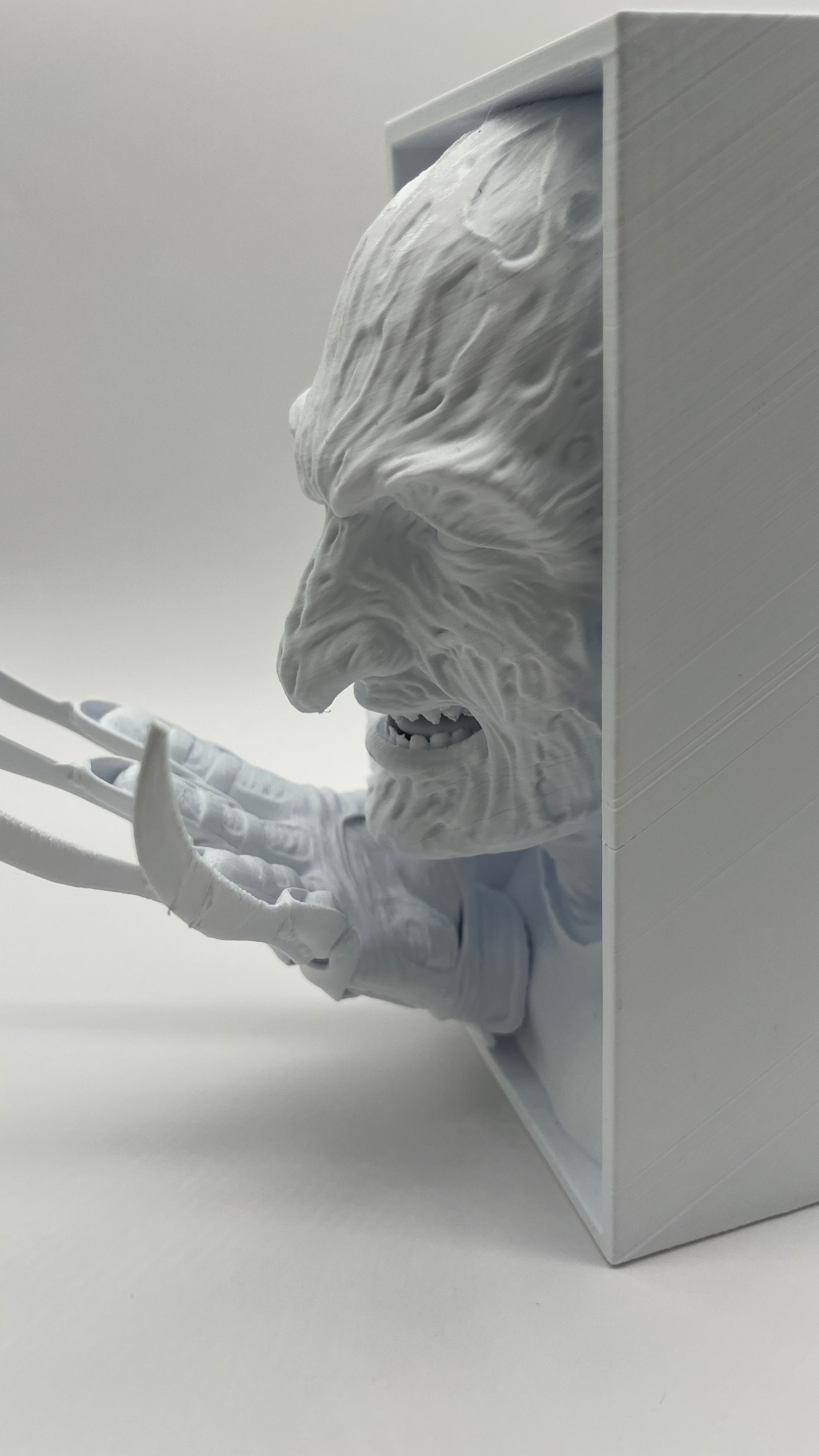 A chilling shelf insert that looks like it’s clawing out of your books. This Kruger Book Nook features a textured, horror-style face emerging from a shadowed frame, complete with an outstretched glove and blades, for authentic jump-scare vibes on any shelf. Printed cleanly and crisply, then assembled so that the hand projects forward for 3D depth. Perfect for horror collectors, Halloween displays, or anyone who loves conversation-starting bookshelf art.
