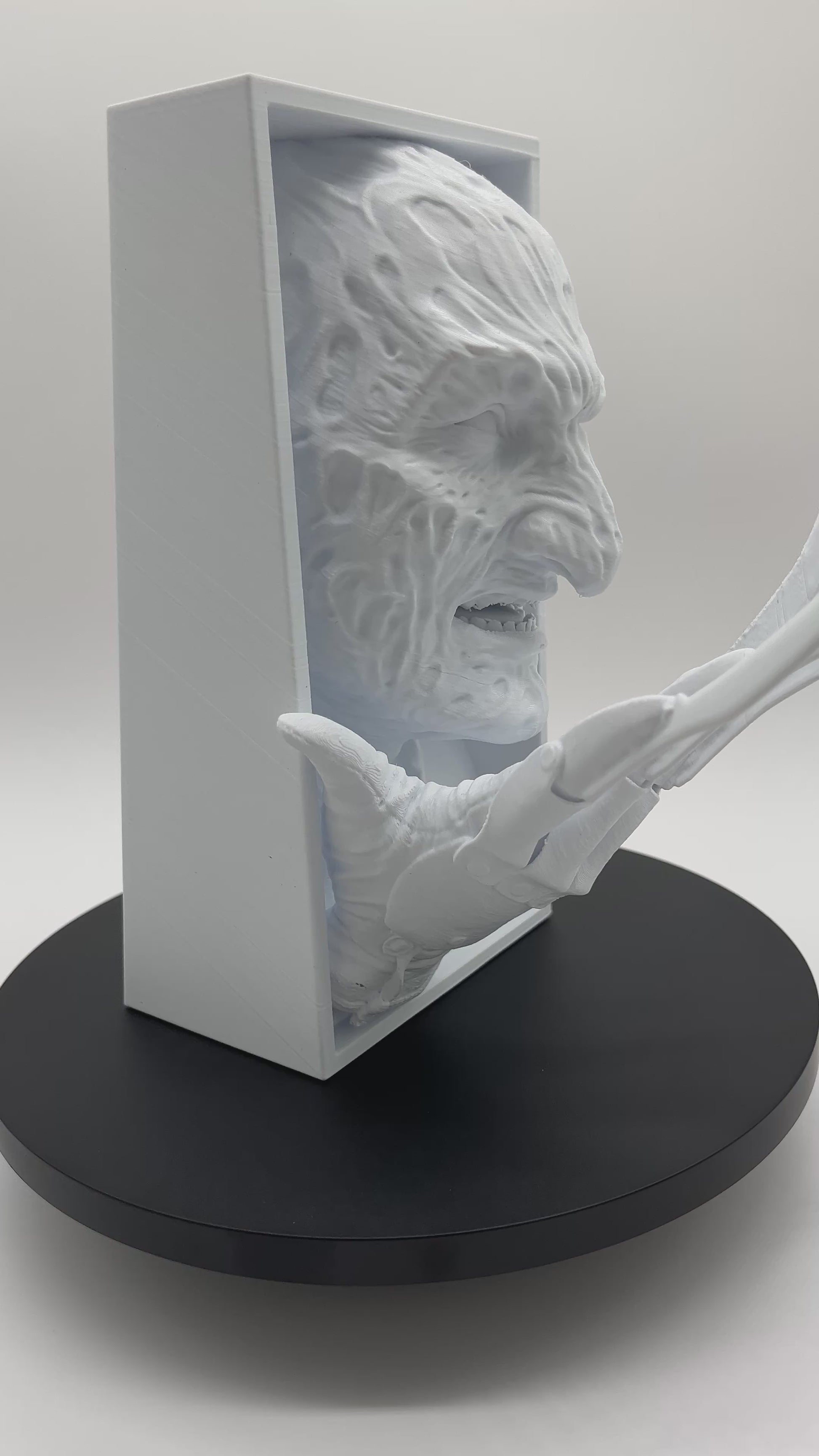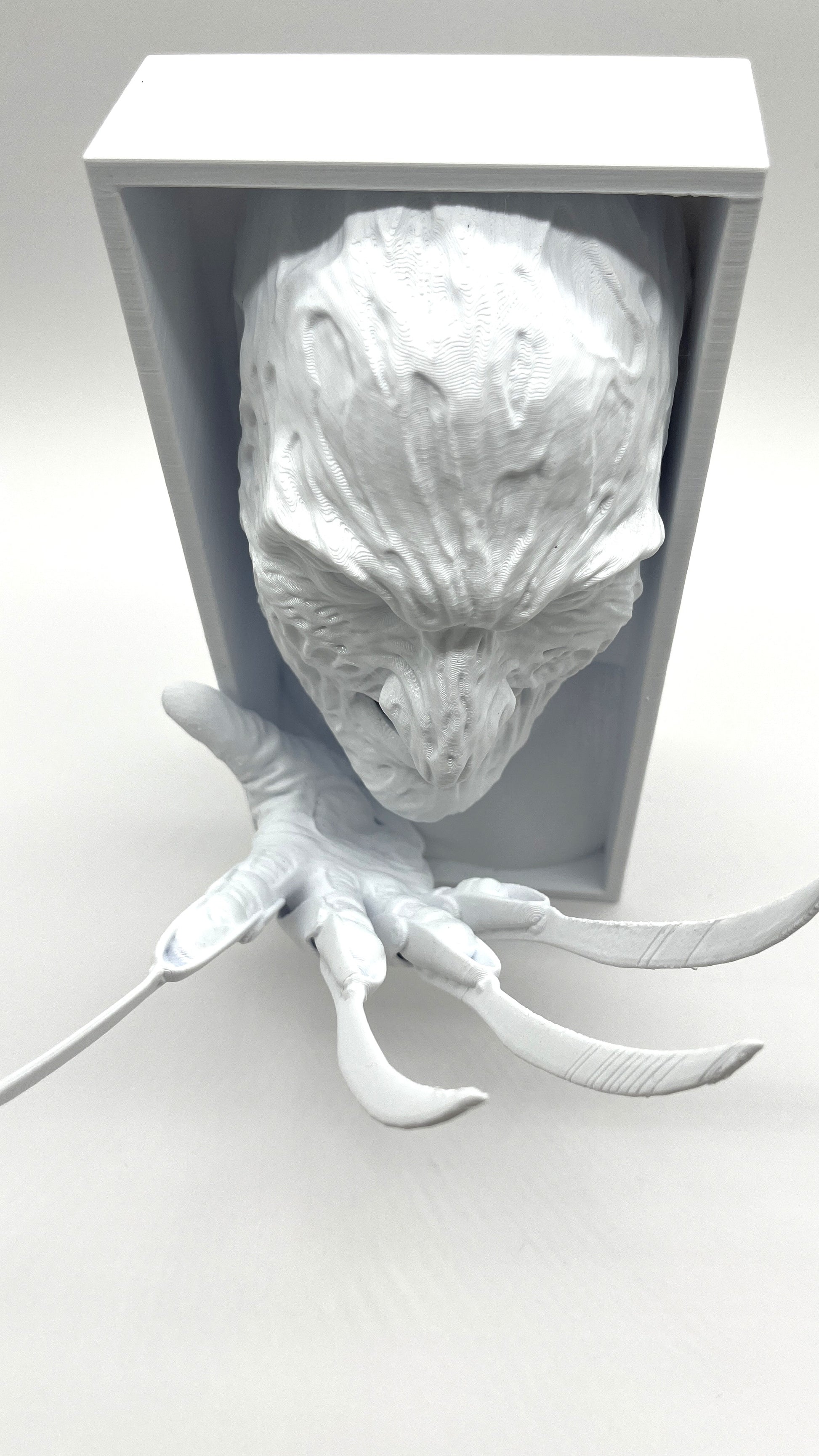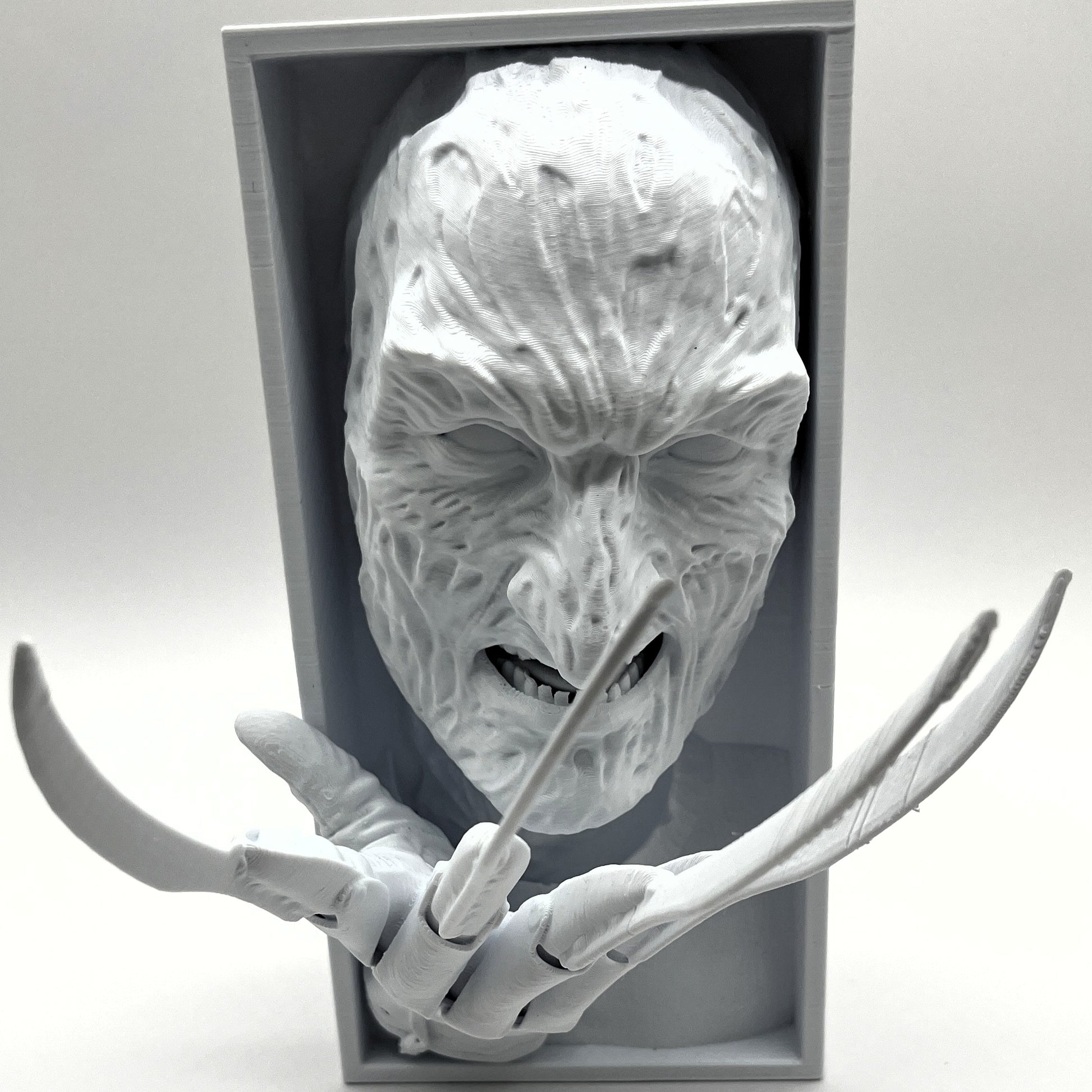 A chilling shelf insert that looks like it’s clawing out of your books. This Kruger Book Nook features a textured, horror-style face emerging from a shadowed frame, complete with an outstretched glove and blades, for authentic jump-scare vibes on any shelf. Printed cleanly and crisply, then assembled so that the hand projects forward for 3D depth. Perfect for horror collectors, Halloween displays, or anyone who loves conversation-starting bookshelf art.