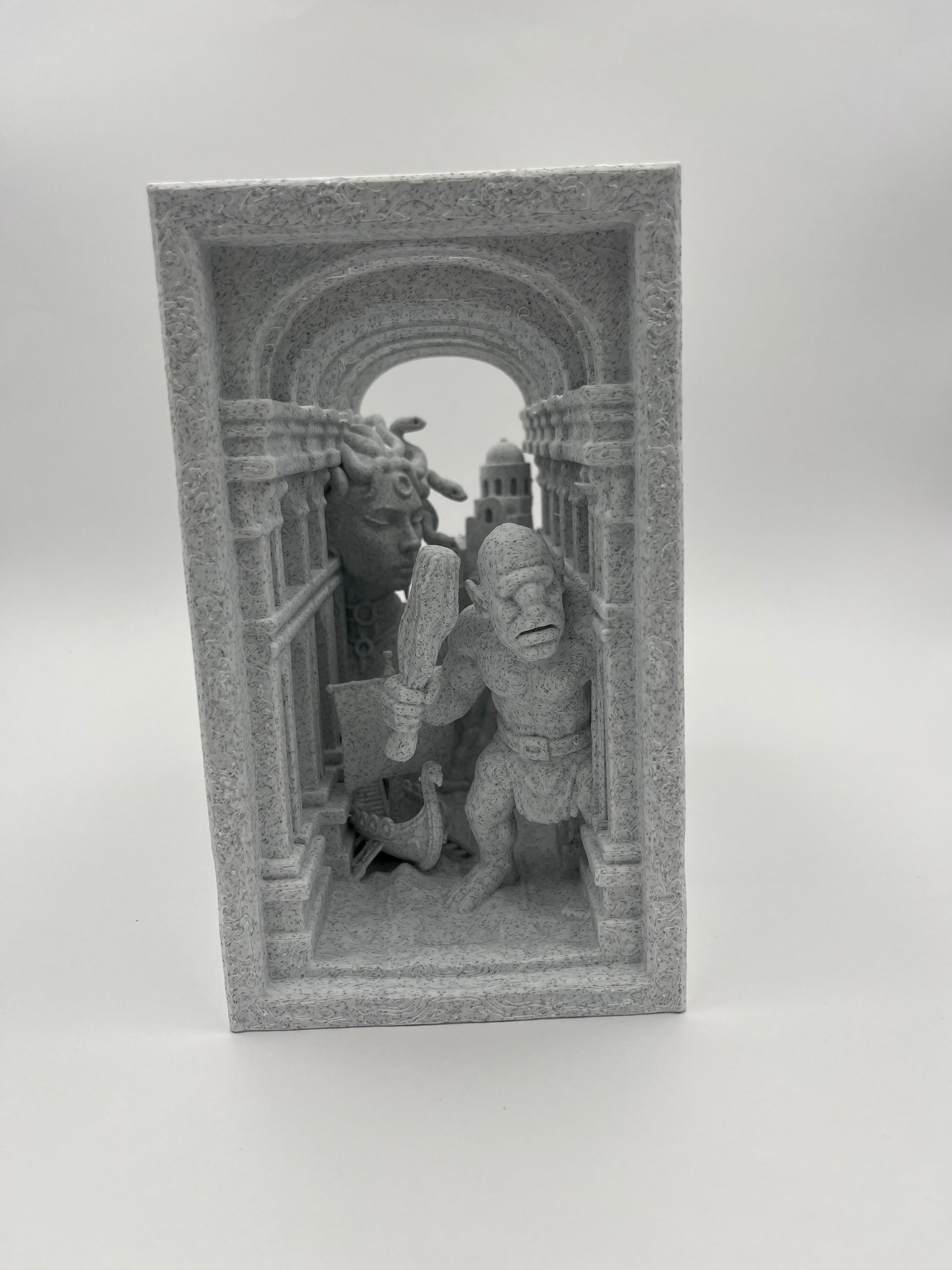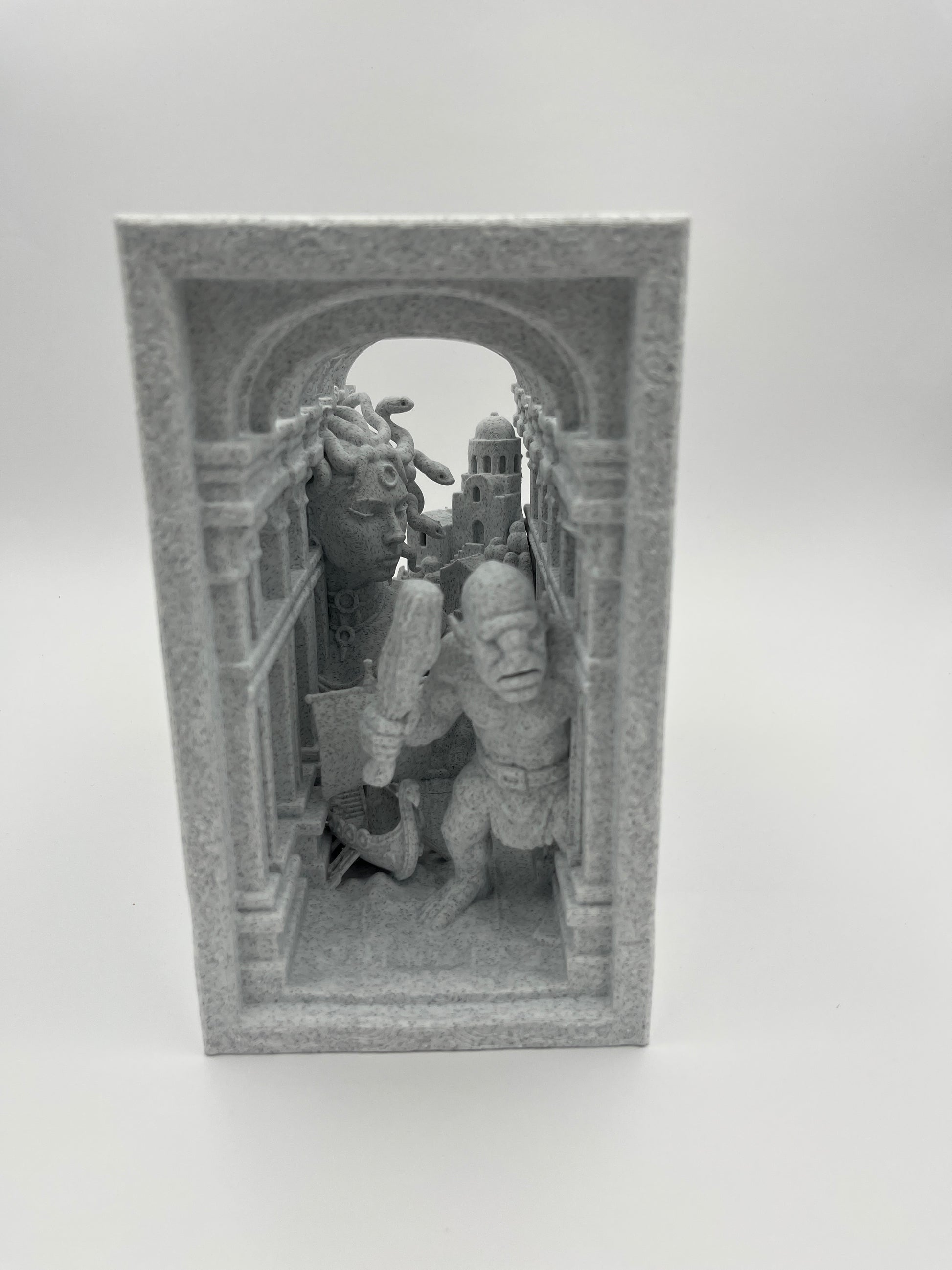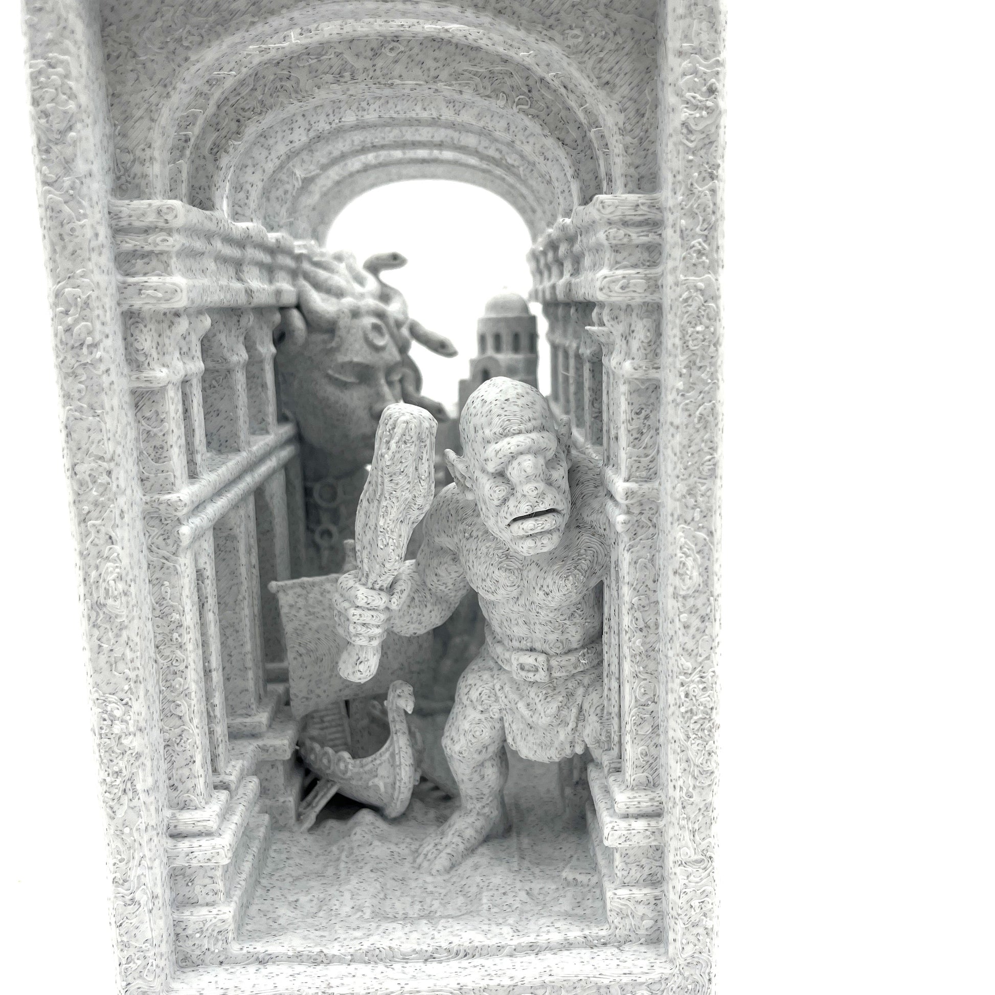 Deep 3D diorama featuring Medusa, a charging warrior, and ancient arches