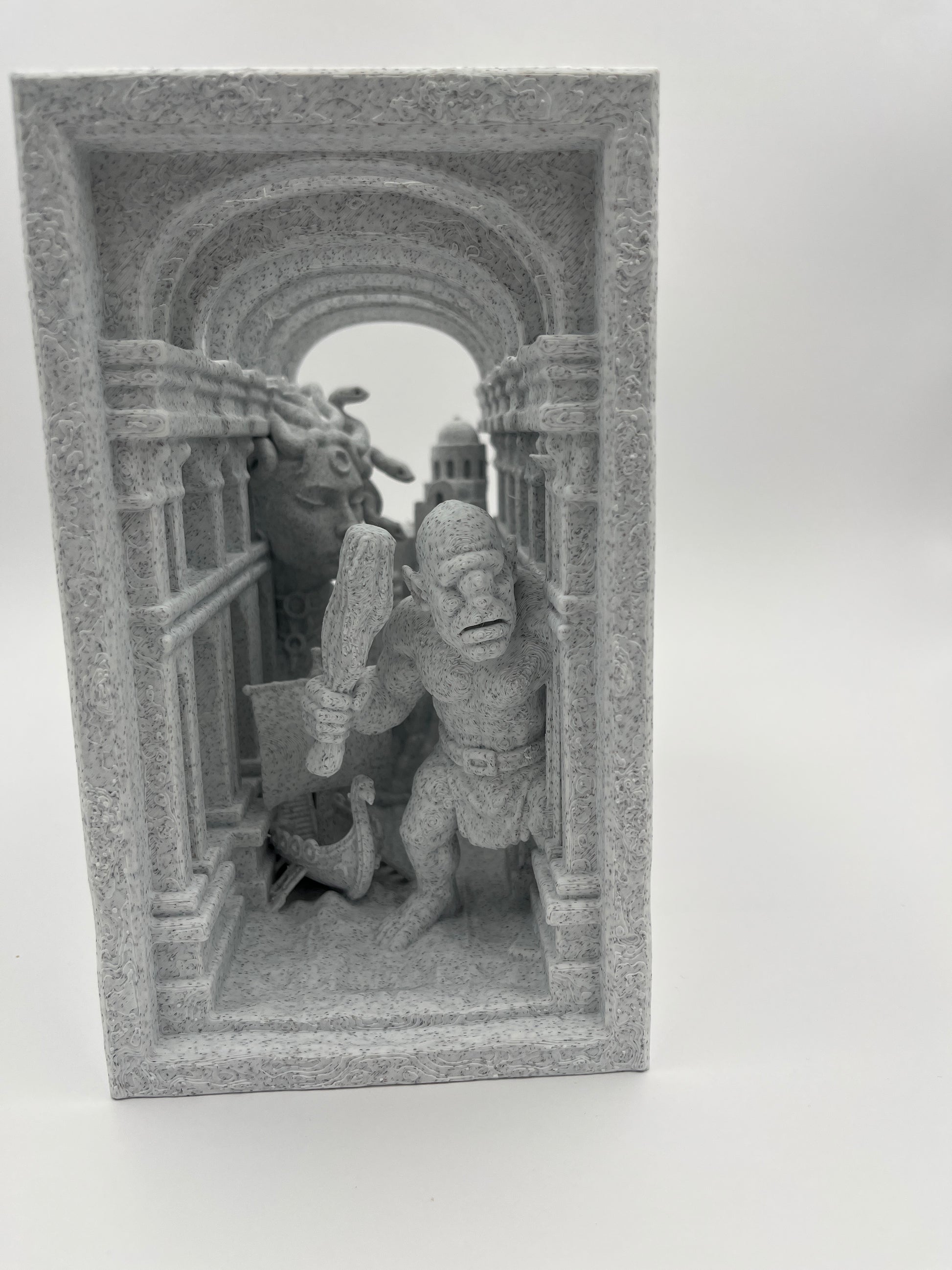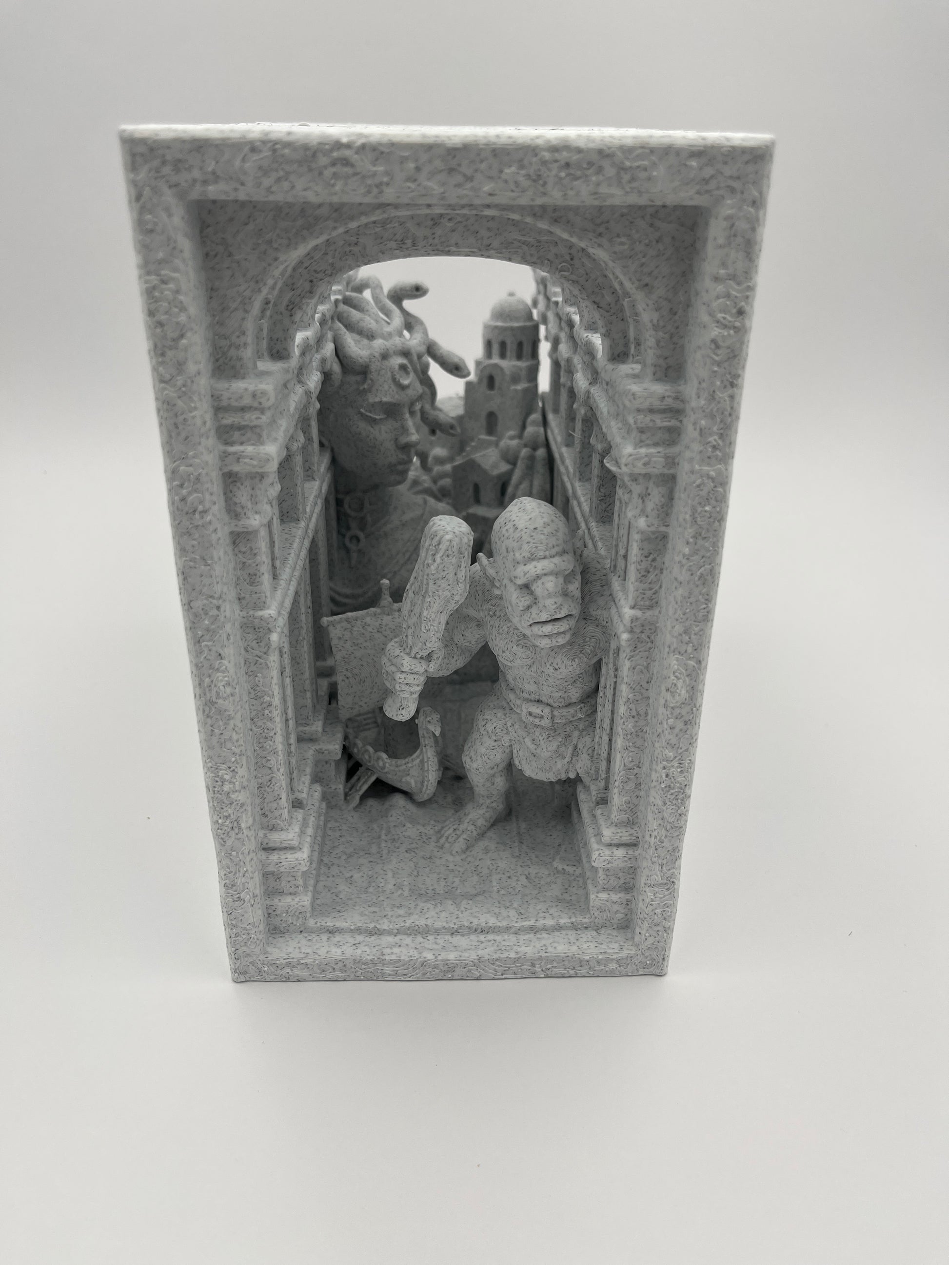 Transform your shelf into a mythic passageway with this Medusa & Minotaur Book Nook. Intricate columns, a looming gorgon, and a heroic defender create a cinematic scene that draws the eye down a “stone” corridor. Each piece is 3D printed by 3BC Creations for clean detail and long-lasting display.