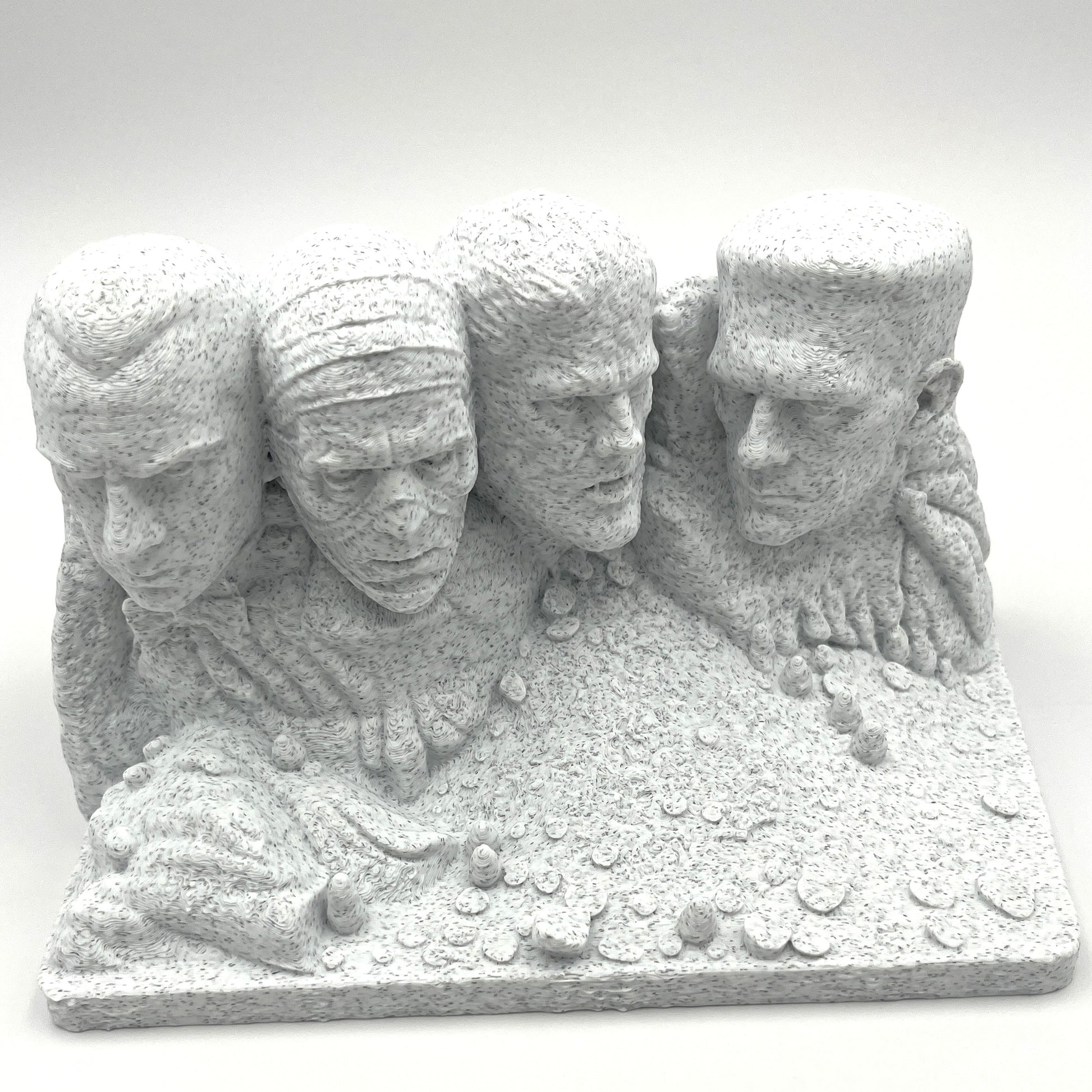 Give your shelf a legendary fright with Monster Rushmore—a marble-look sculpture that blends classic monsters into a single “carved” cliff face. The speckled stone finish and layered textures read like weathered rock, making a striking conversation piece for desks, mantels, and Halloween displays.