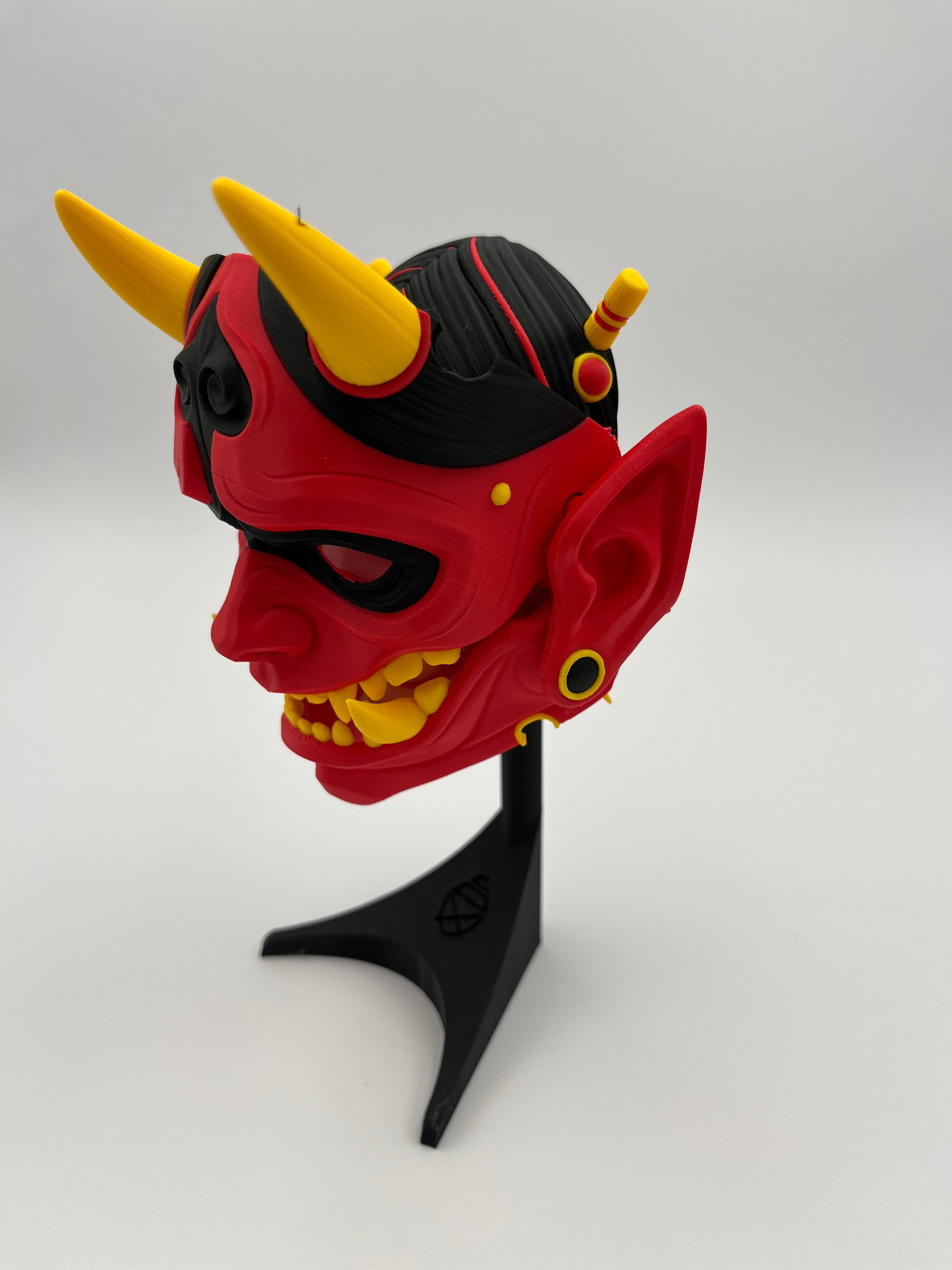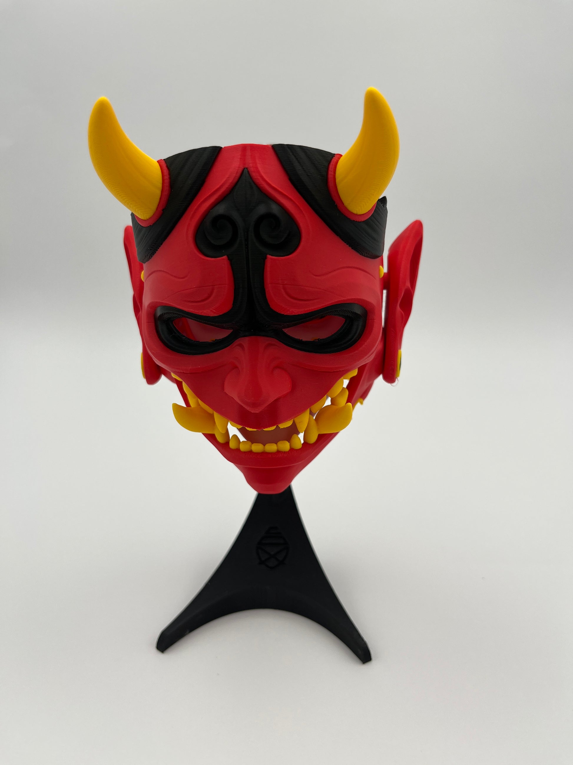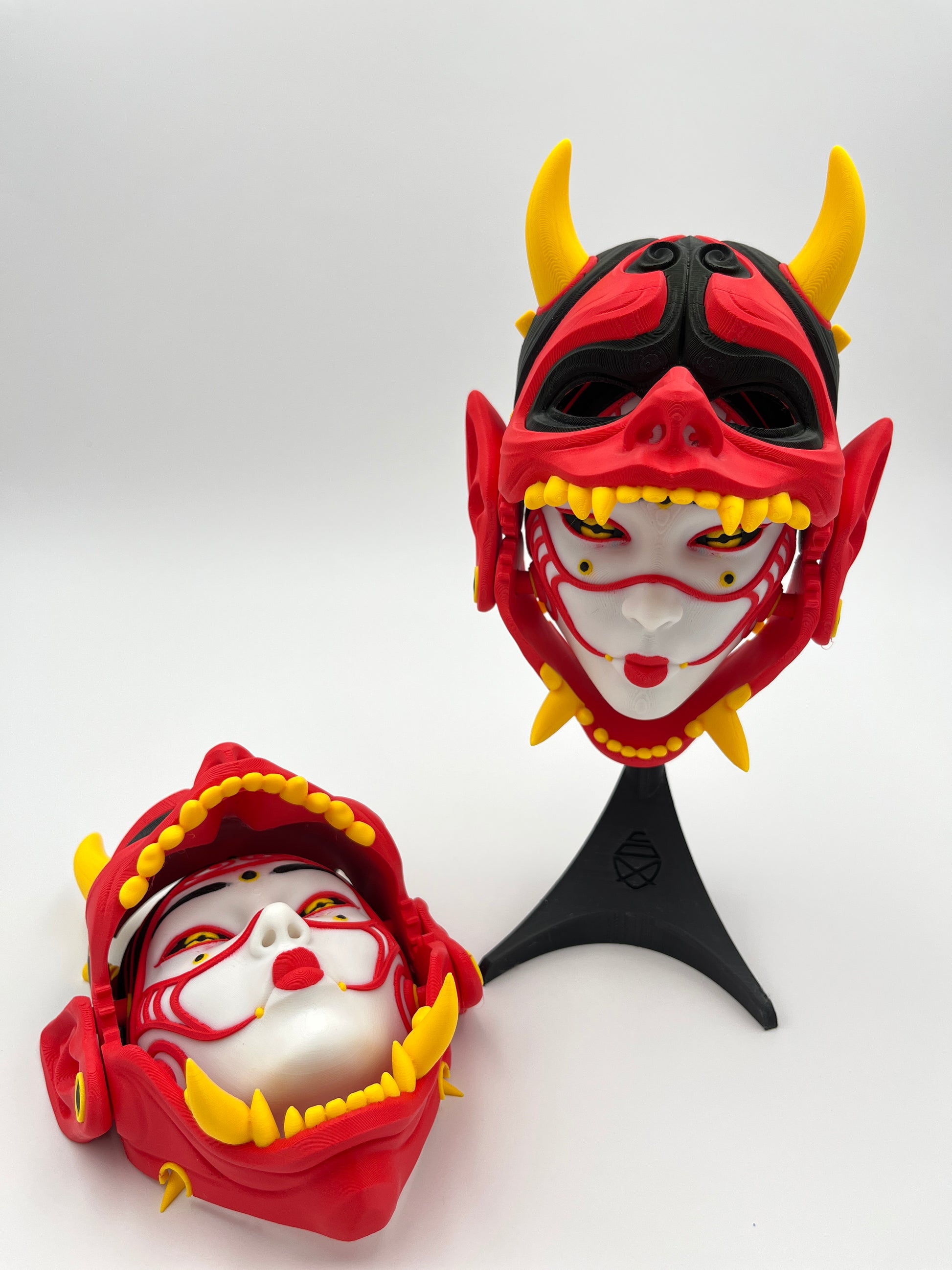 Turn heads with Oni_no_Geisha, a bold, multi-color mask that can be shown open or closed for two dramatic looks. Display it on the wall or on a tabletop—both mounting options are included for easy setup.