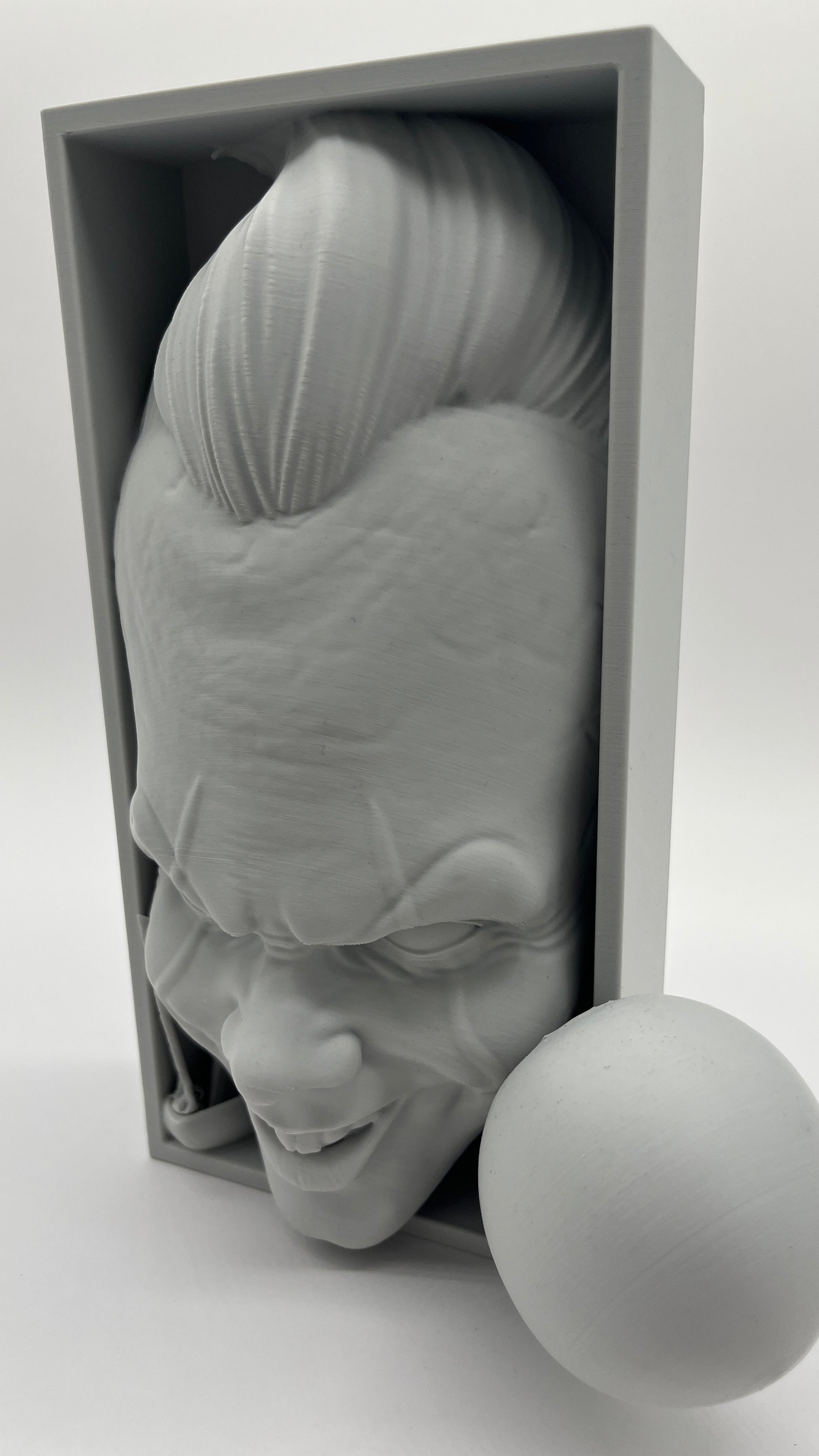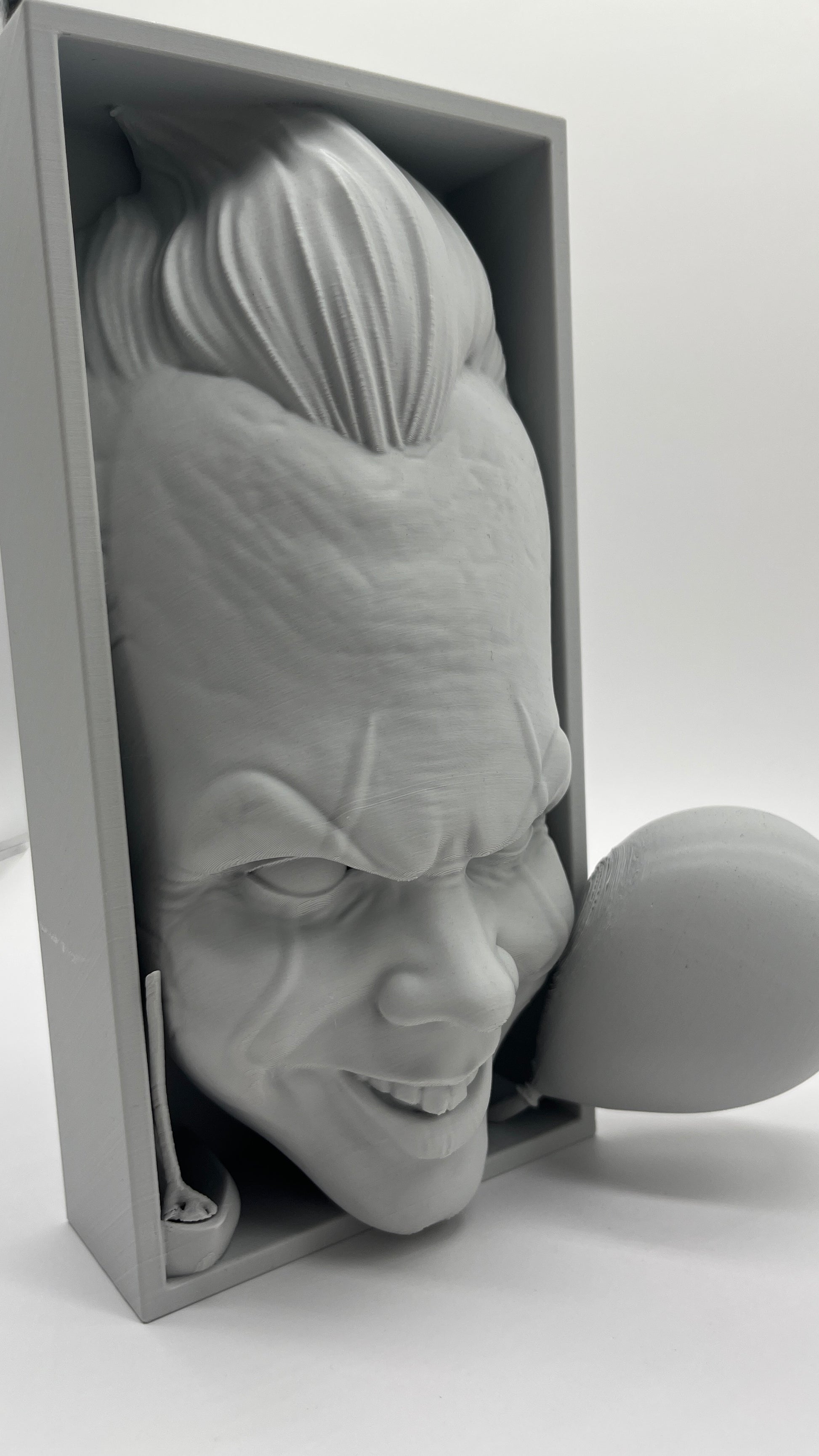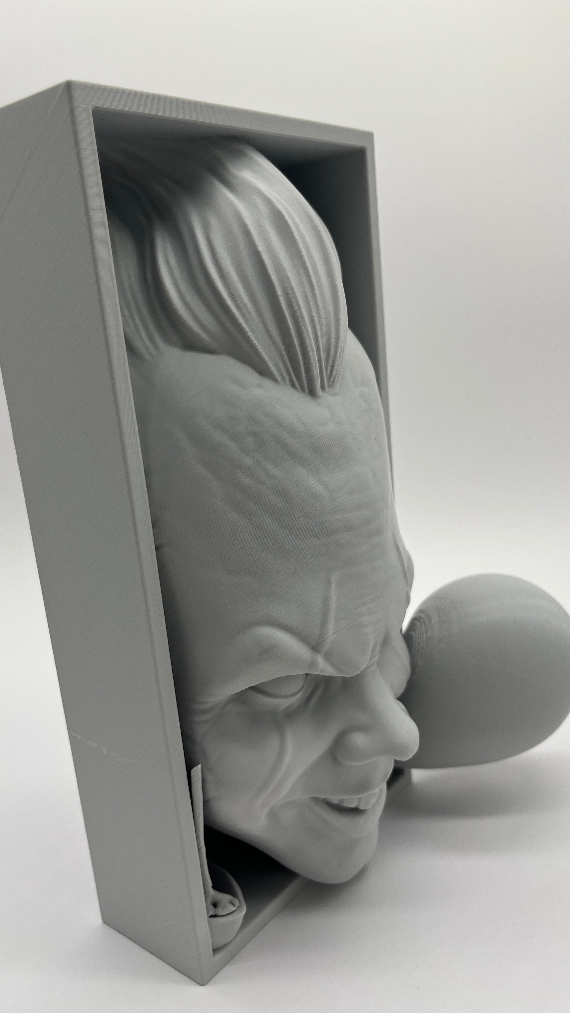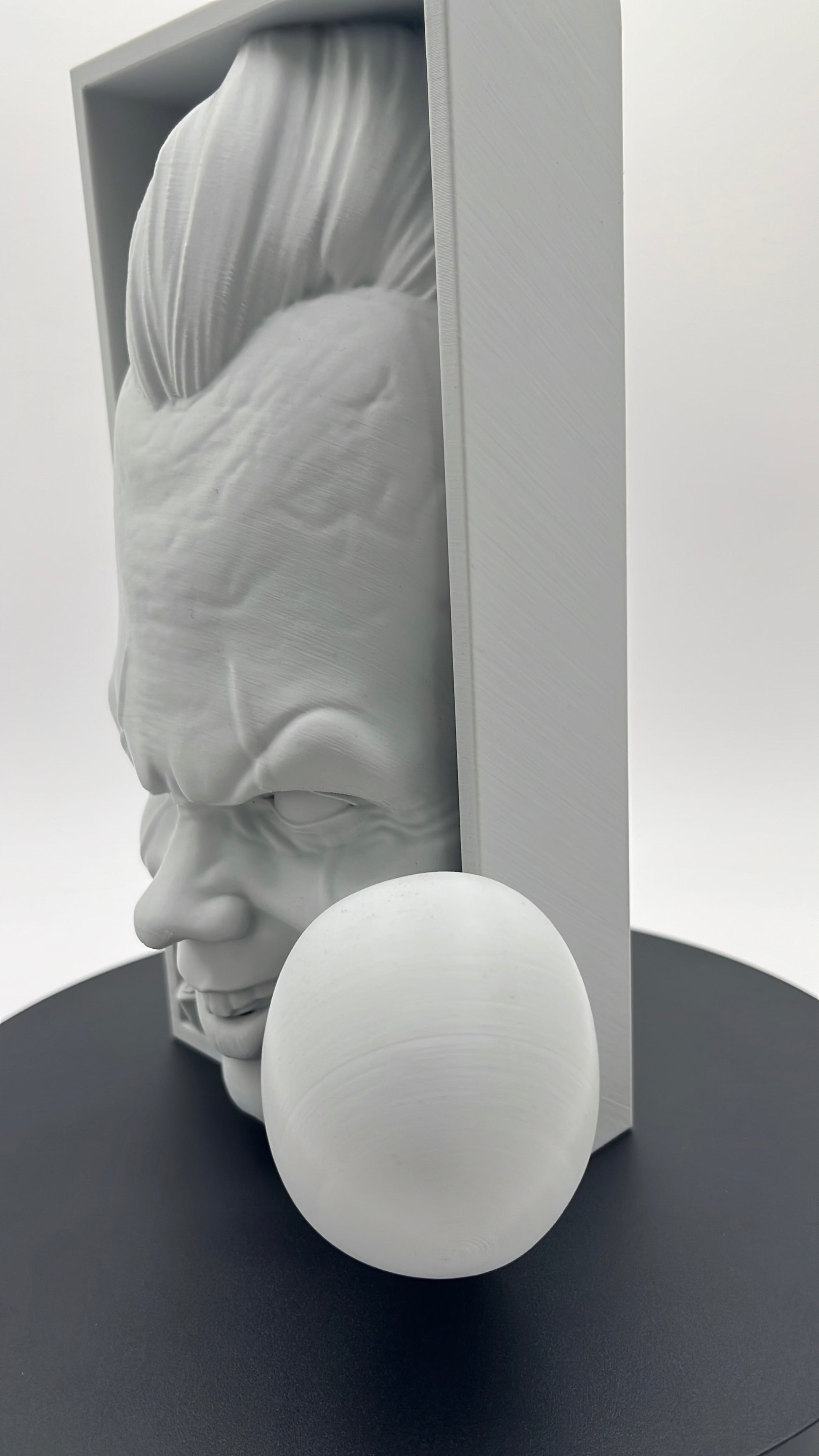 Turn your shelf into a jump-scare. This wall-mount book-nook style face bursts forward with wicked grin and oversized forehead—perfect for horror displays and collectors. Printed clean and crisp, then finished for sharp surface detail. Ships ready to hang with a paper mounting template for easy alignment.