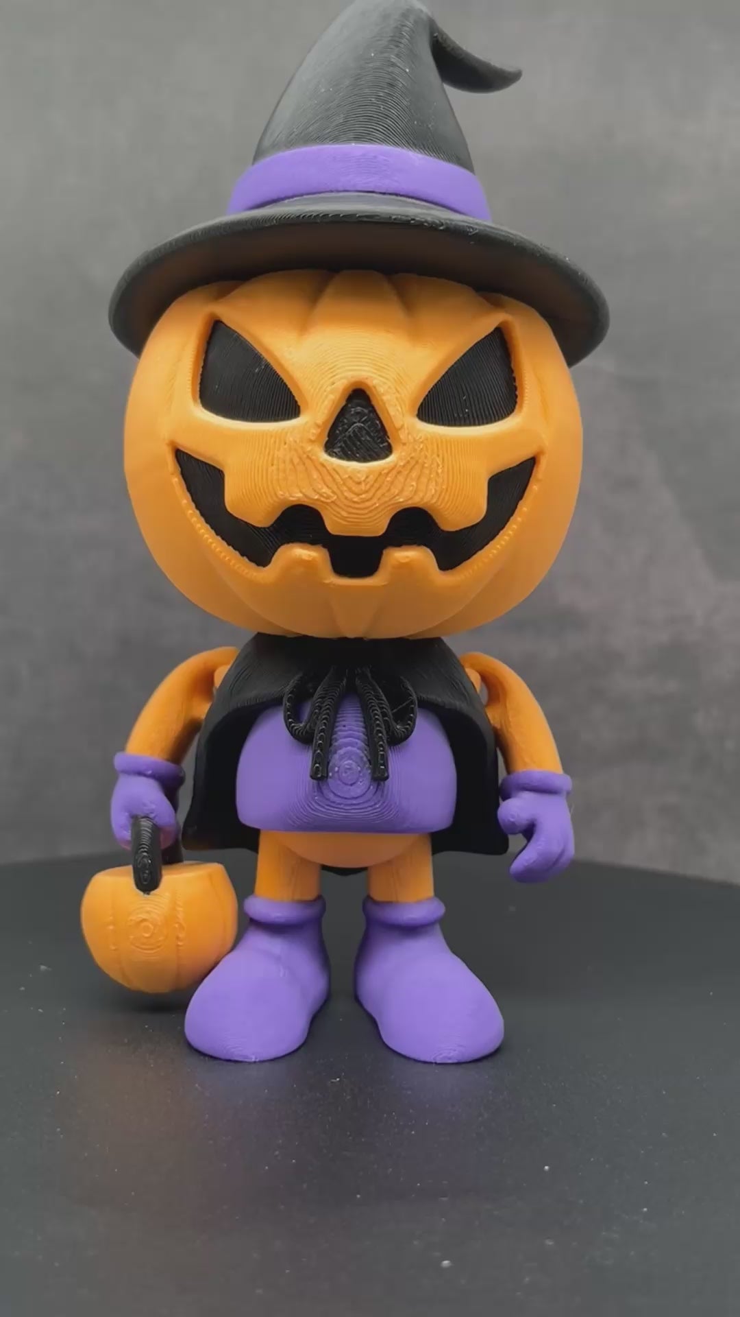 Meet the Pumpkin Trickster—a cute Halloween companion with a wide jack-o’-lantern grin, swirled witch hat, and mini pumpkin pail. Clean multi-color printing brings out the crisp face cuts and cape details for a display piece that pops in photos and on your shelf.