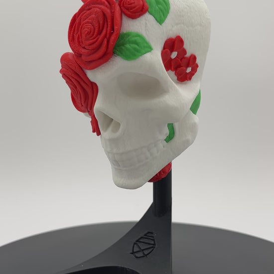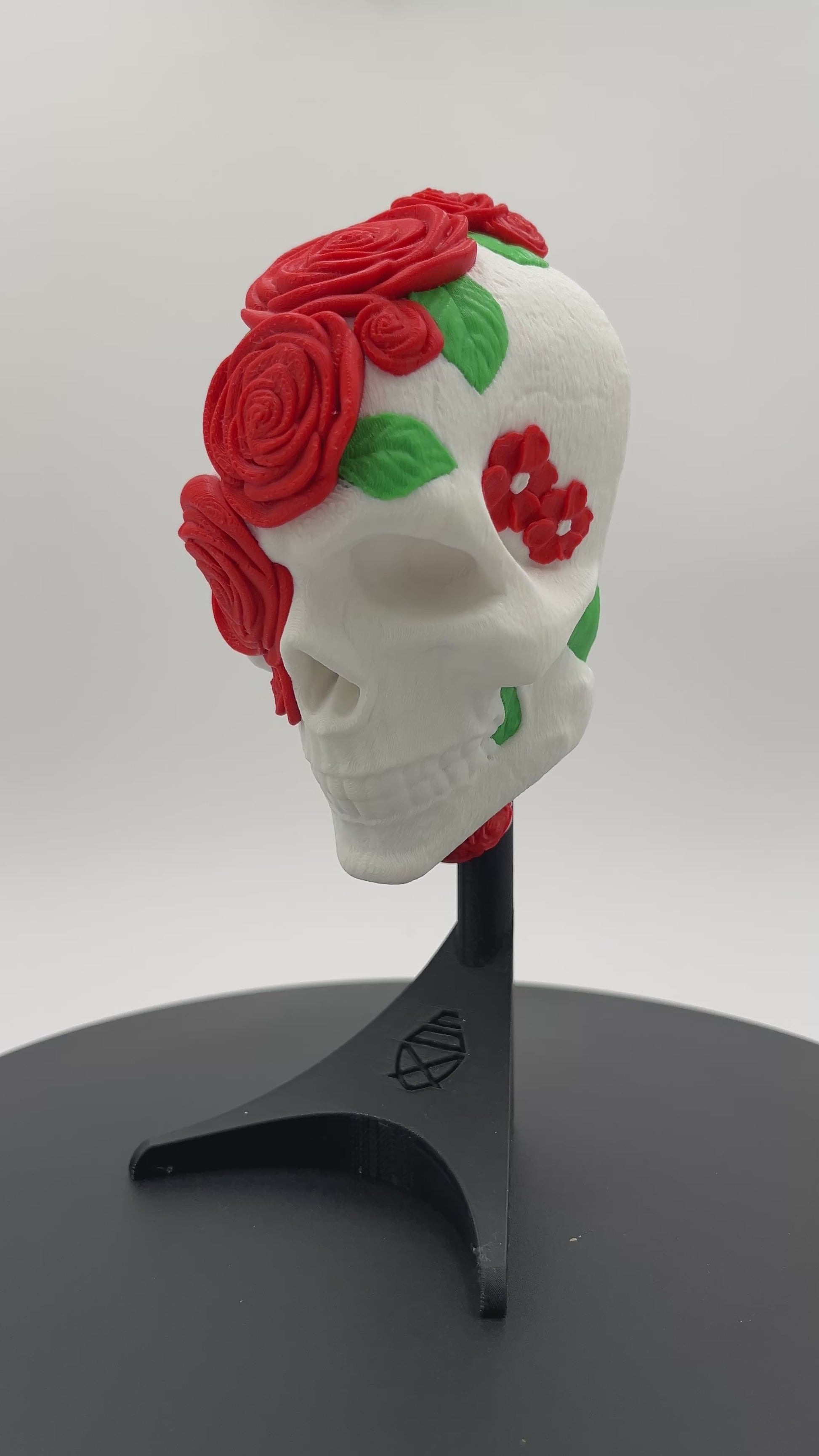 ring a touch of gothic elegance with the Rose-Crowned Skull—a sculpted skull wrapped in bold red roses and green leaves. Display it on a wall or on a table with the included stand. Each piece is 3D printed with PLA for crisp detail and a smooth, matte look.