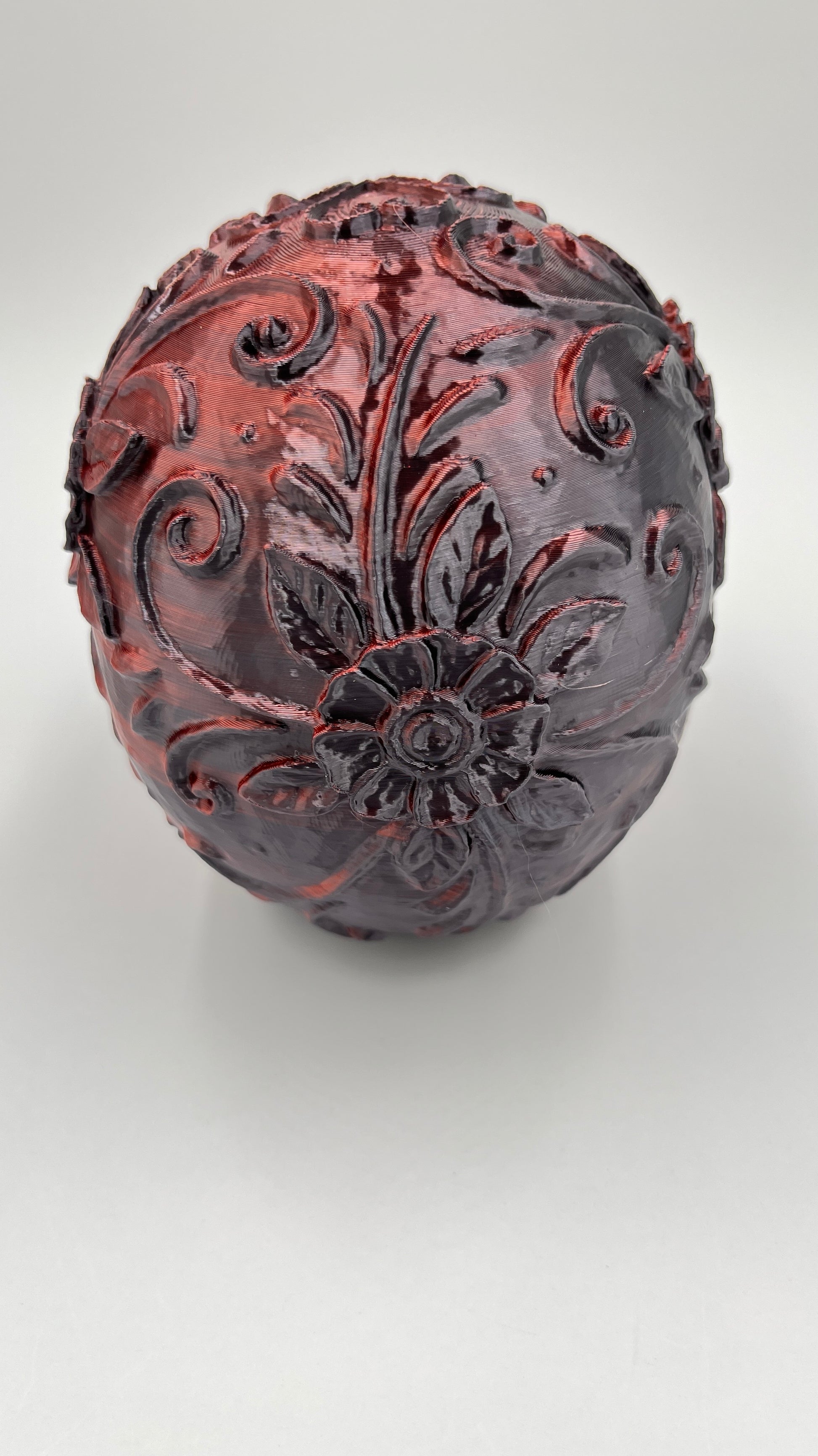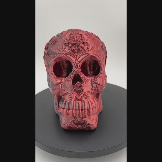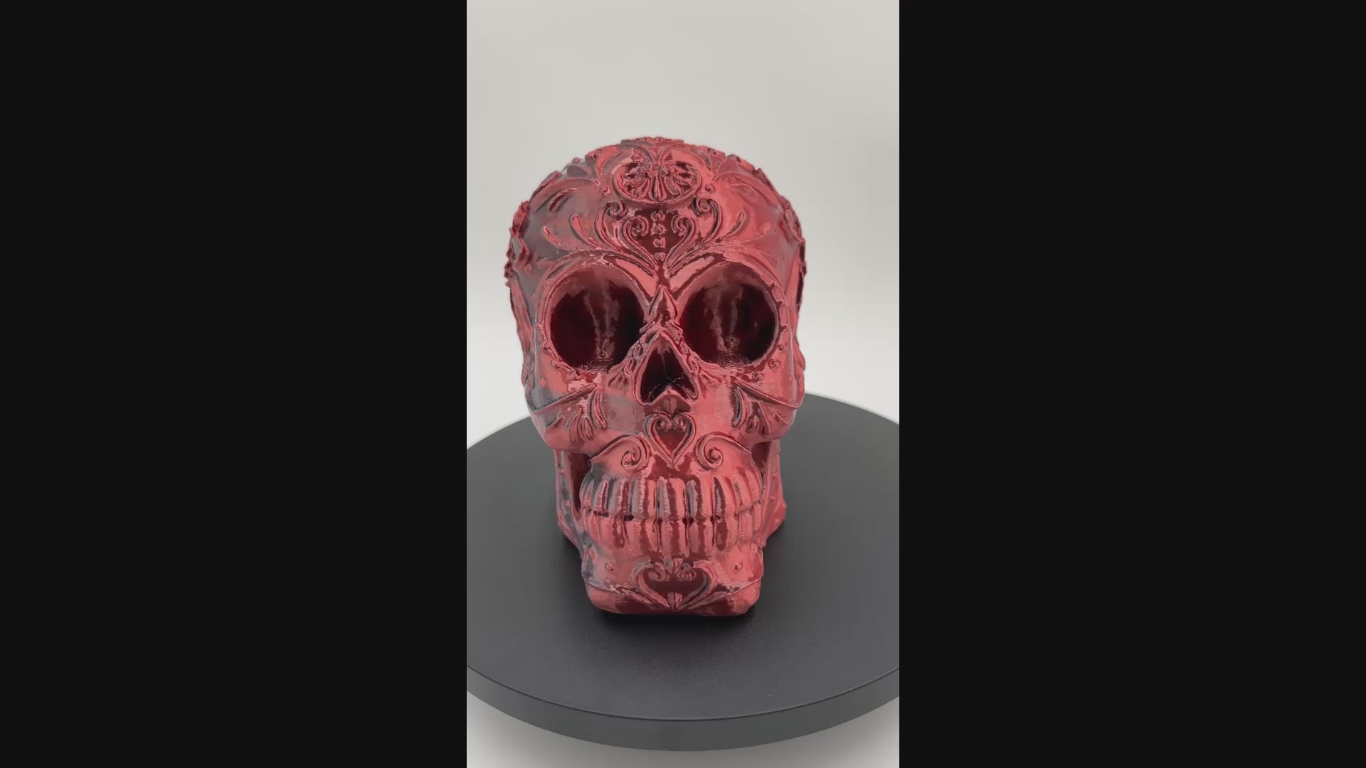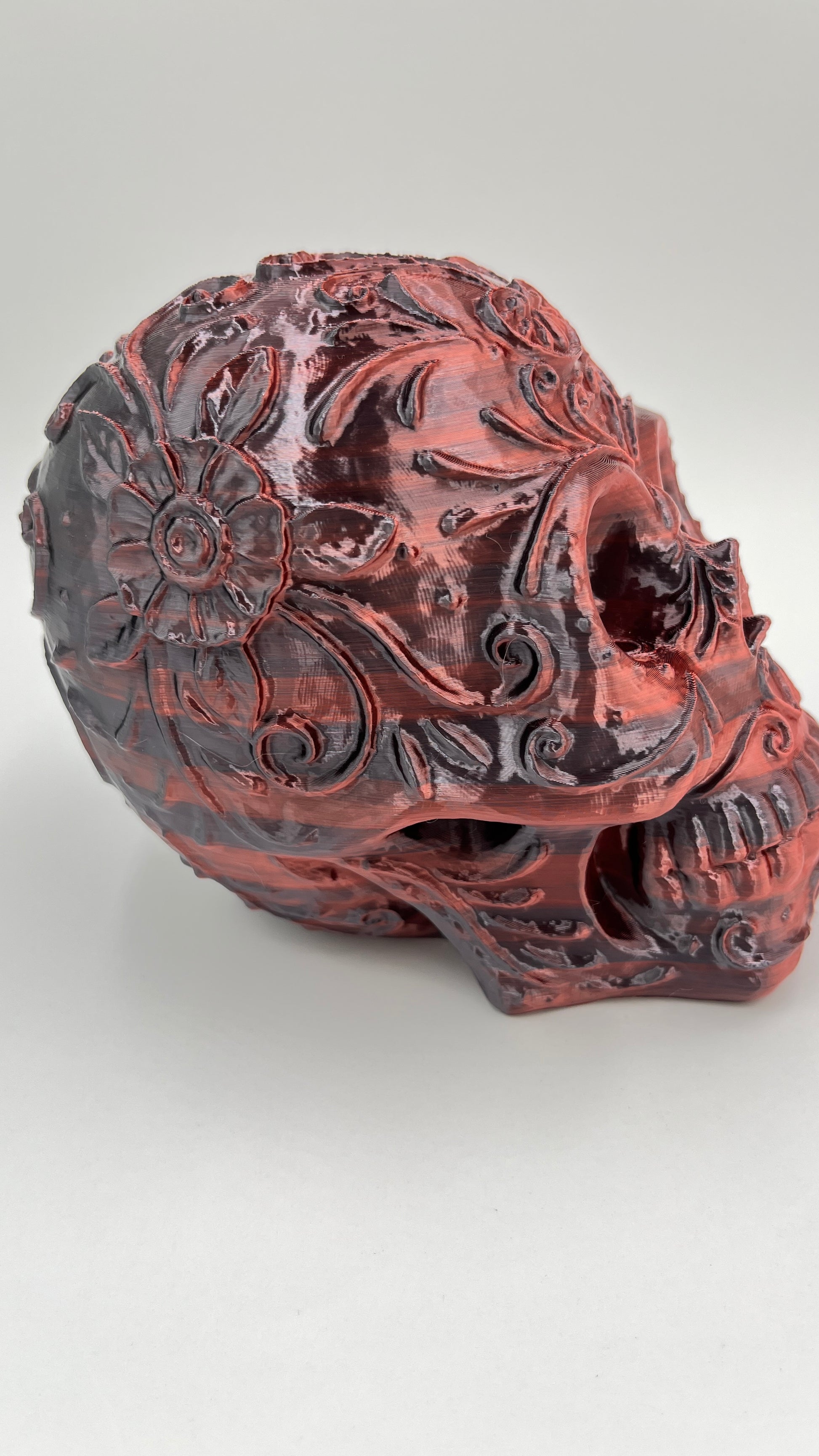 This ornate skeleton head sculpture brings bold gothic flair to shelves, mantels, and Halloween displays. Printed in shimmering silk PLA for a glossy, metallic look that catches the light, Copper & Silver. Crafted by 3BC Creations for crisp detailing and a smooth surface. 3D printed with PLA. Decorative item—not a toy.