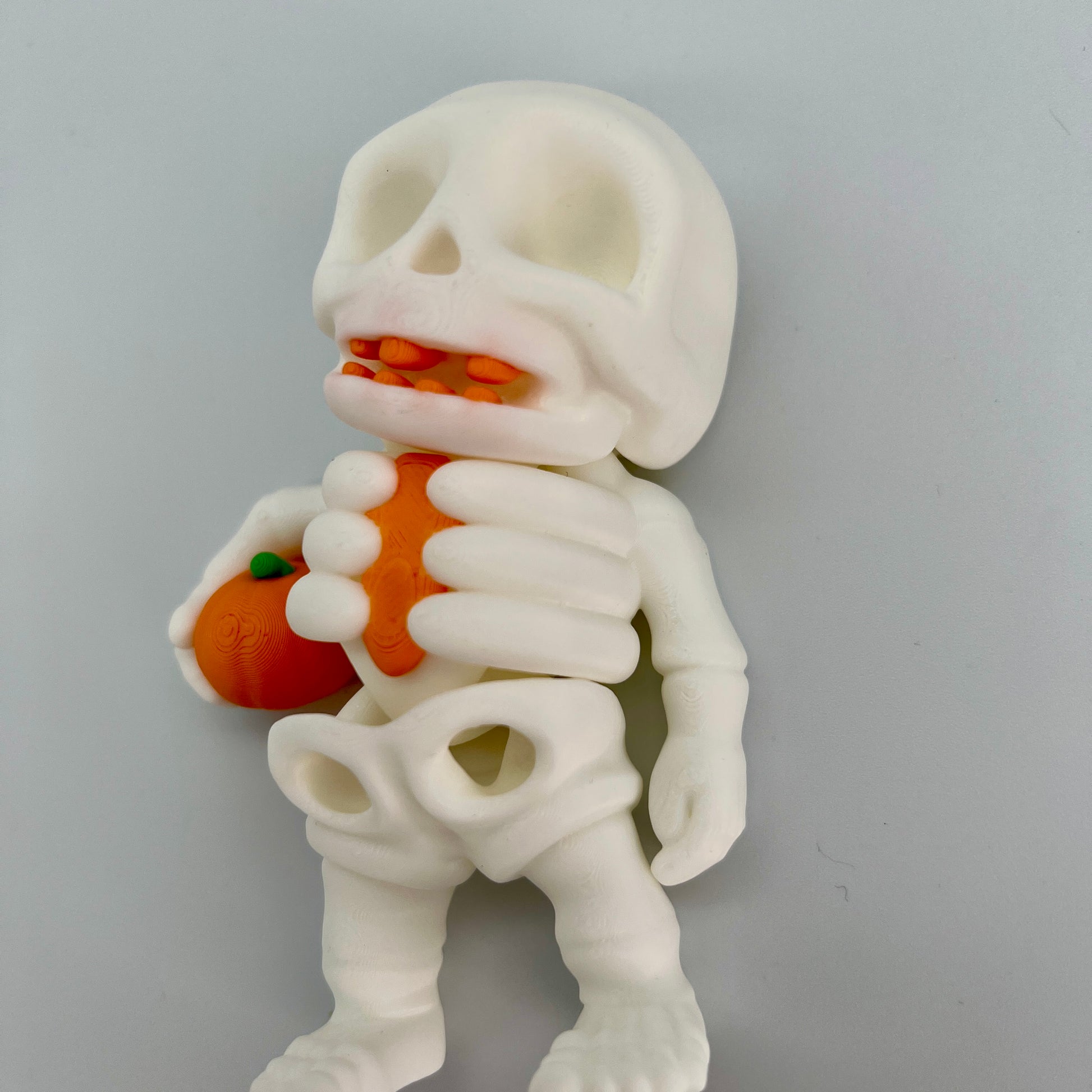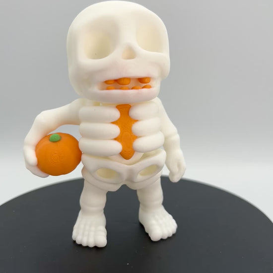 A cute-creepy mini skeleton clutching a pumpkin—perfect for shelves, desks, and Halloween displays. Printed with crisp bones and a bright orange core for pop.