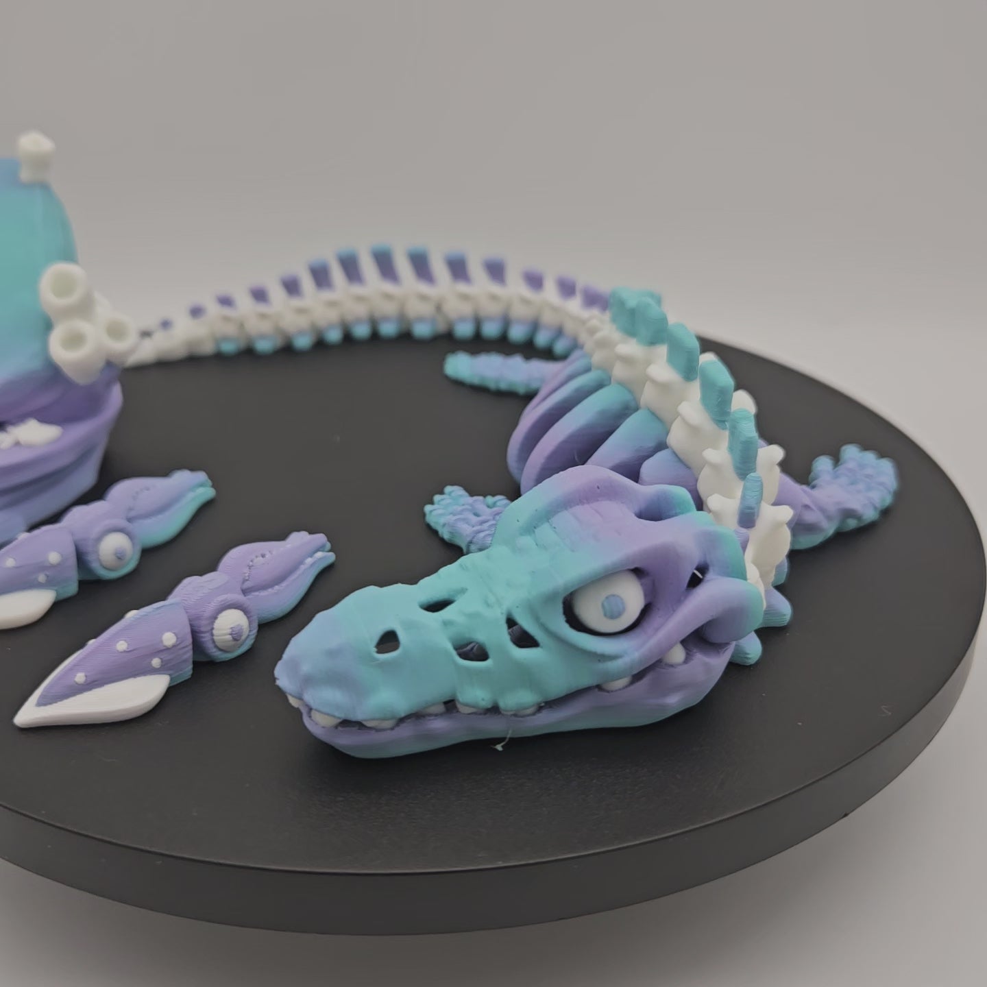 Make a splash on any shelf with this eye-catching Skeleton Mosasaurus—finished in a frosty winter-blue and purple gradient with crisp white bones. The long, sea-serpent silhouette rests low with a toothy grin, while two cheeky squid minis and a themed display stand complete the scene. Printed in high detail and smoothed for a matte look, it’s an instant conversation piece for Dino lovers, ocean fans, and collectors alike.