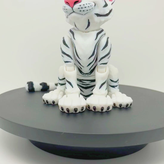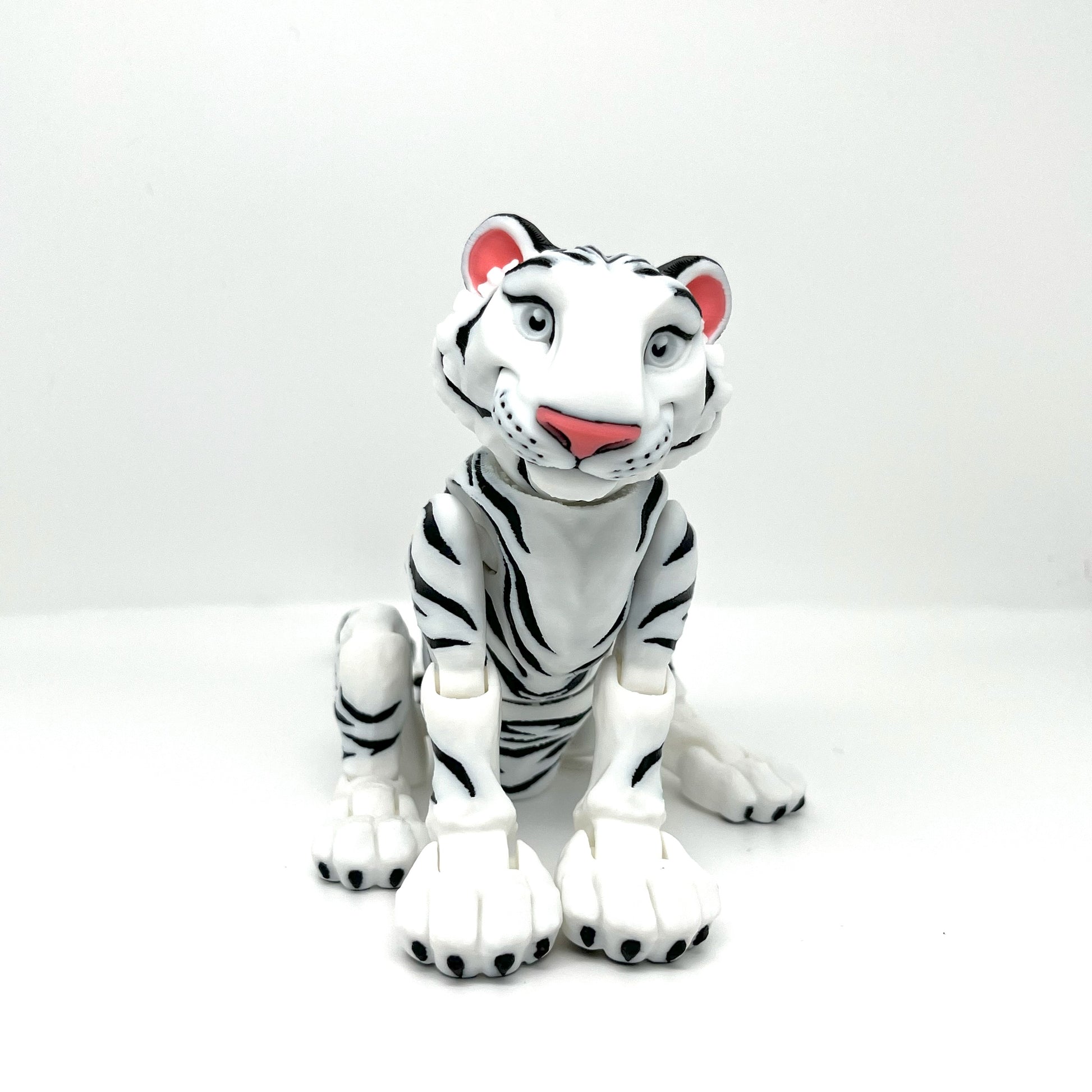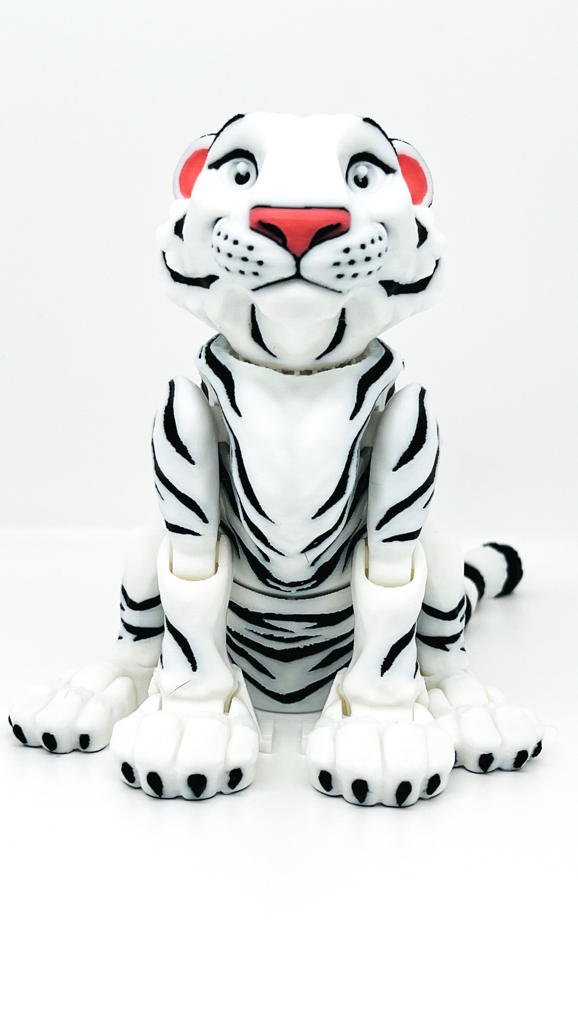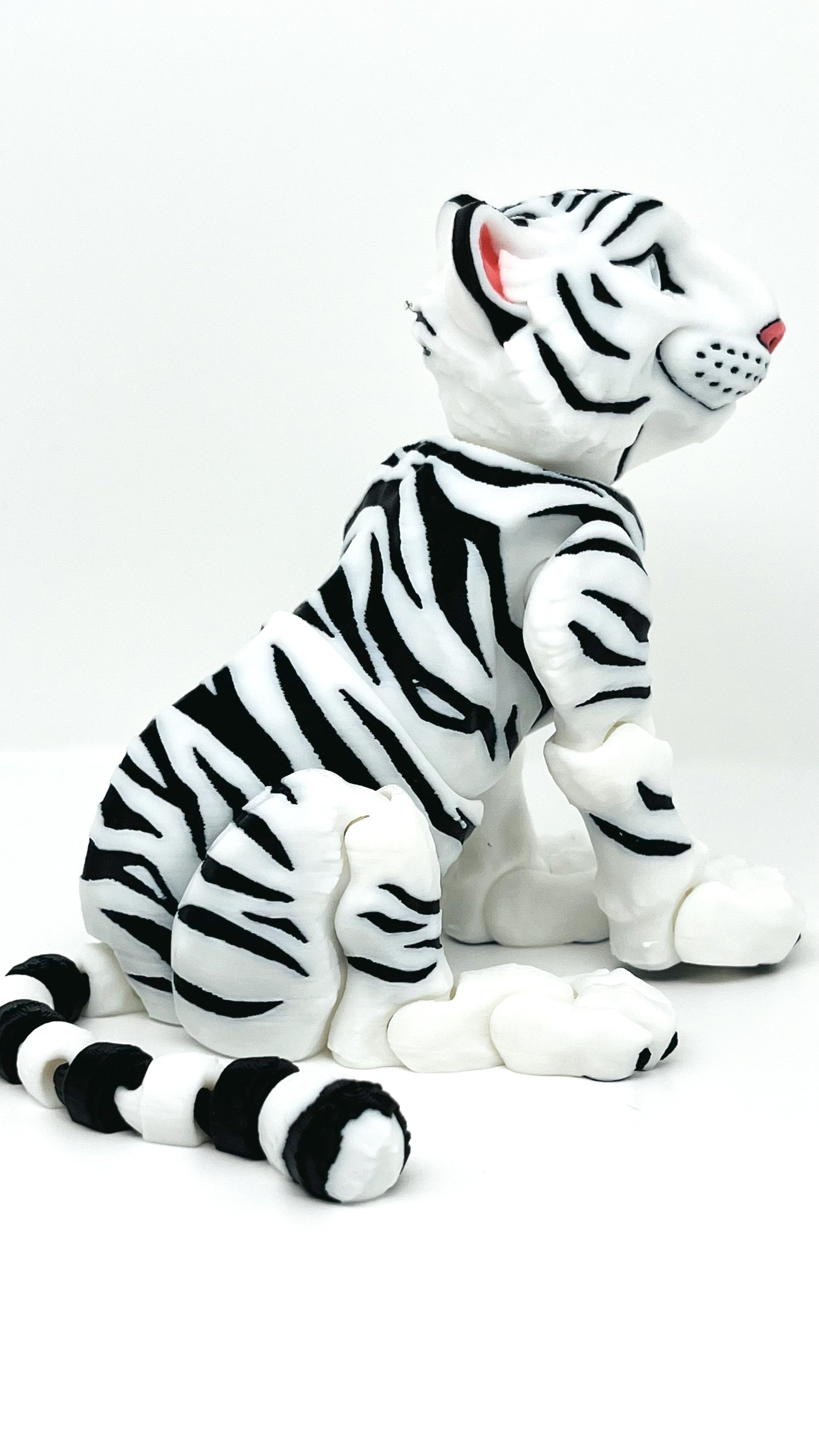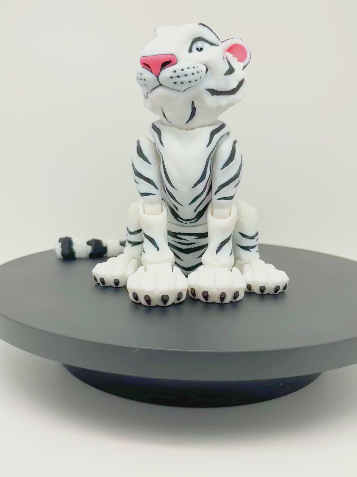 Bring home a striking White Tiger Cub—bright white with inky stripes, a sweet pink nose, and expressive eyes. This collectible is 3D-printed with clean details and light articulation, allowing it to sit, tilt, and pose for photos. Great for animal lovers, décor, or a unique gift.